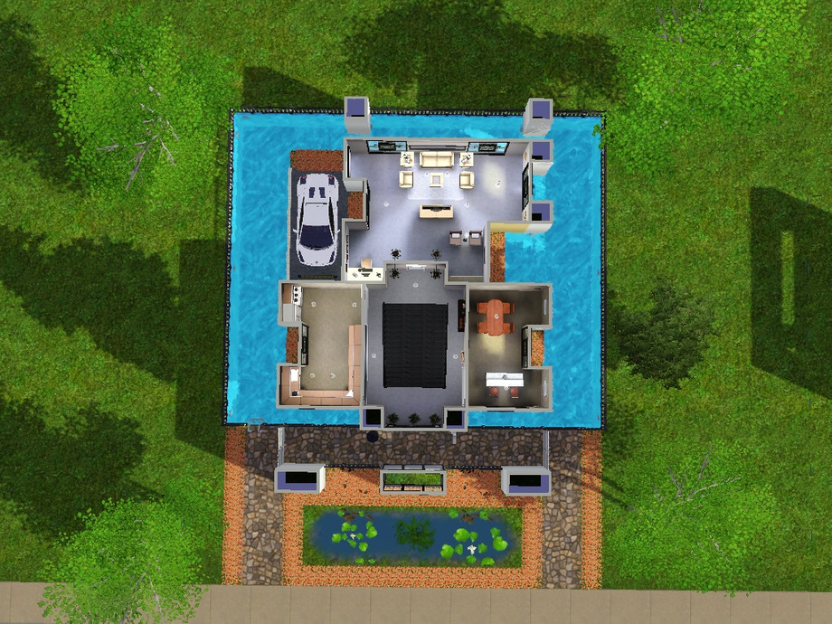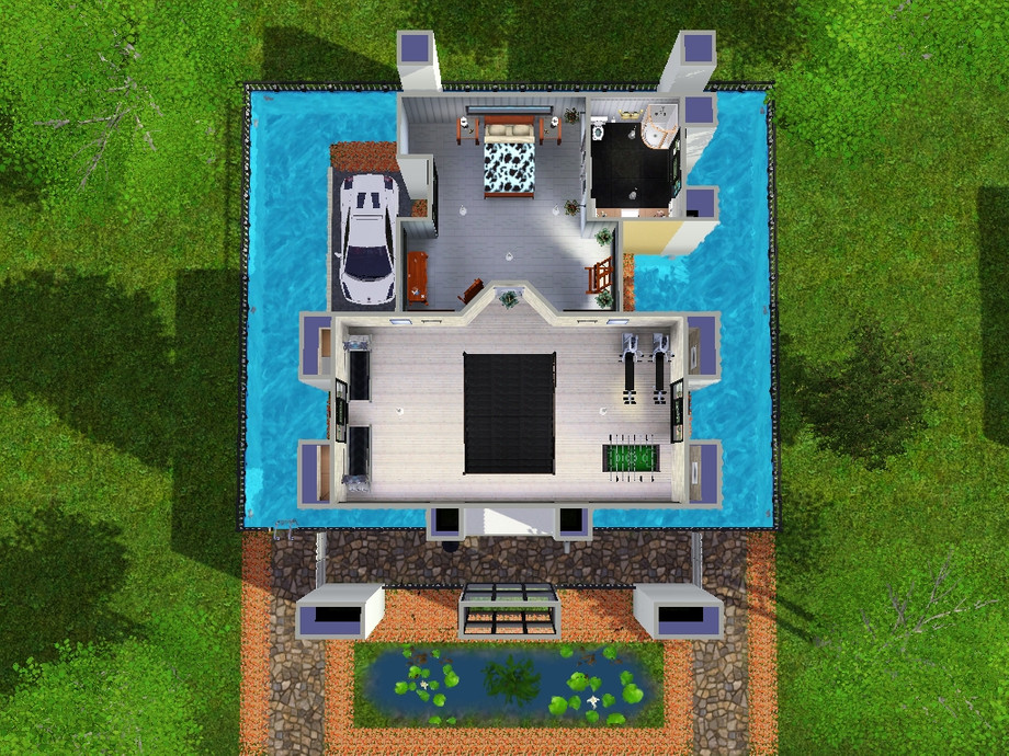 A different type of contemporary house (it looks like a beach house, in my opinion) with pillars to make it look more extravagant and unique. It has 1 bedroom and 1 bathroom, nice size living room, kitchen, dining room, foyer with staircase, outdoor pool surrounding the house, 1 car-spot with car included, and a gym.