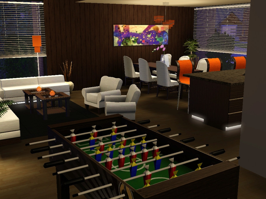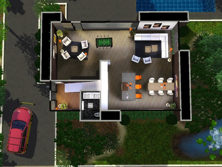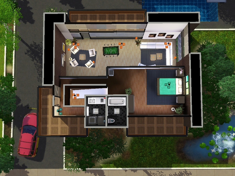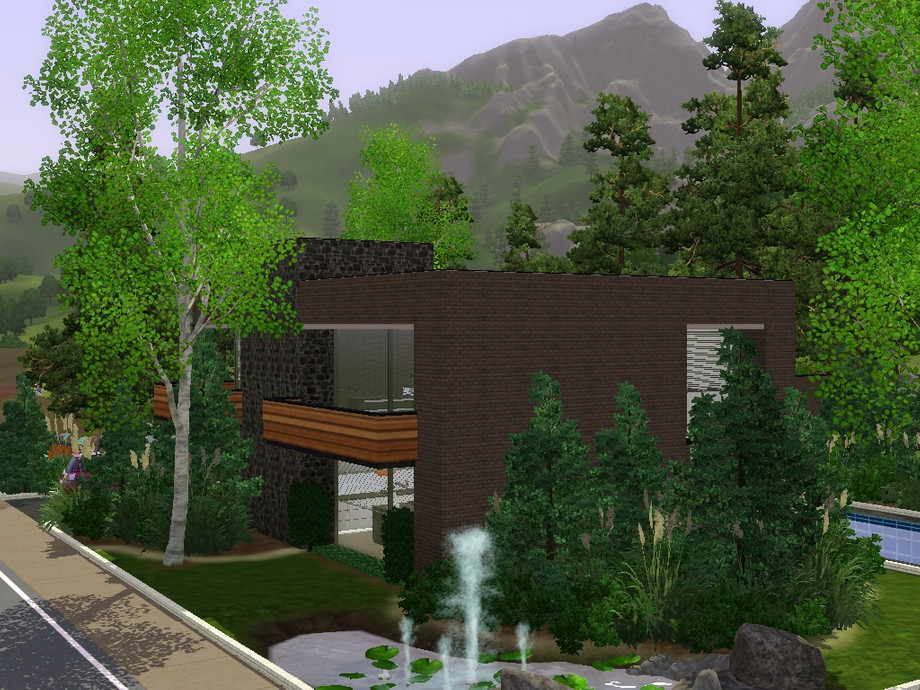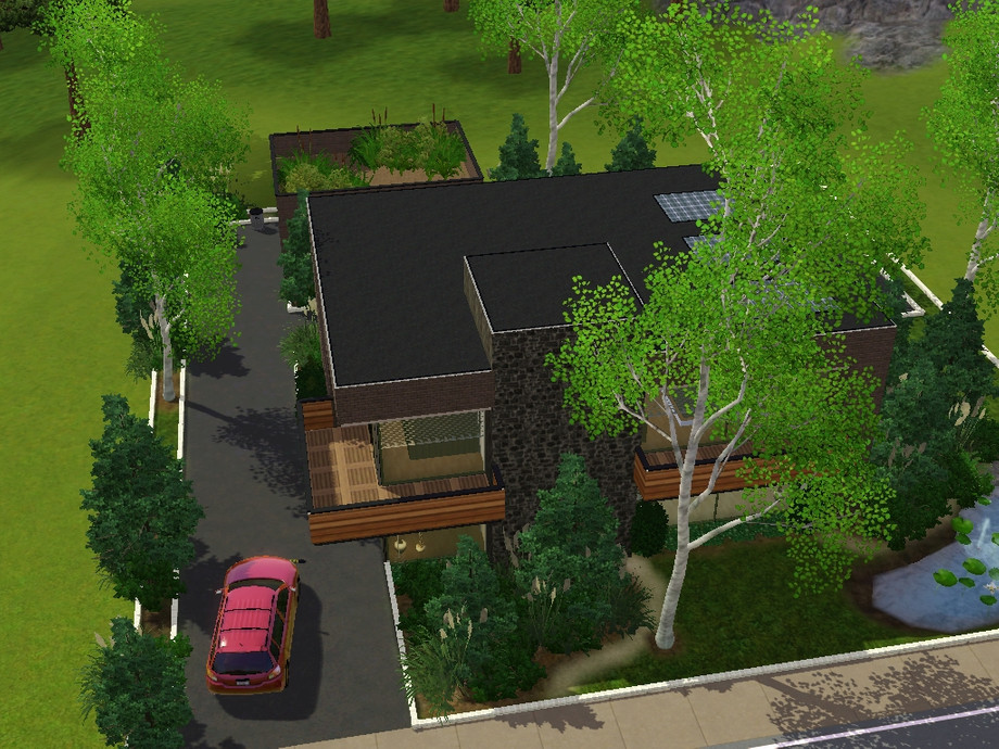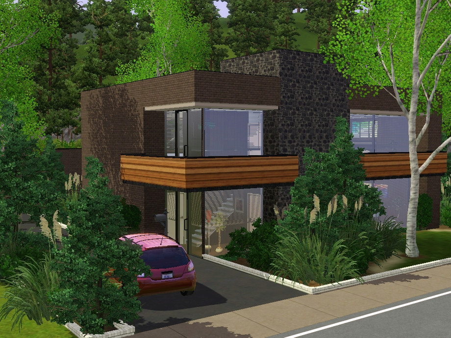 A modern house located in Sunset Valley. The house is surrounded by a lot of plants, scenery and fresh air. The big windows on each side of the house let in a lot of natural light from the sun. Your Sims are one with the nature. The house has 1 huge bedroom with its own balcony, 1.5 bathroom. an open plan area with the kitchen, diningroom, livingroom and a study/entertainment area. The house costs $132496 when it's furnished and $84645 when it's unfurnished
