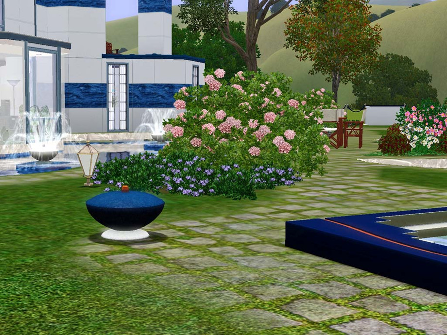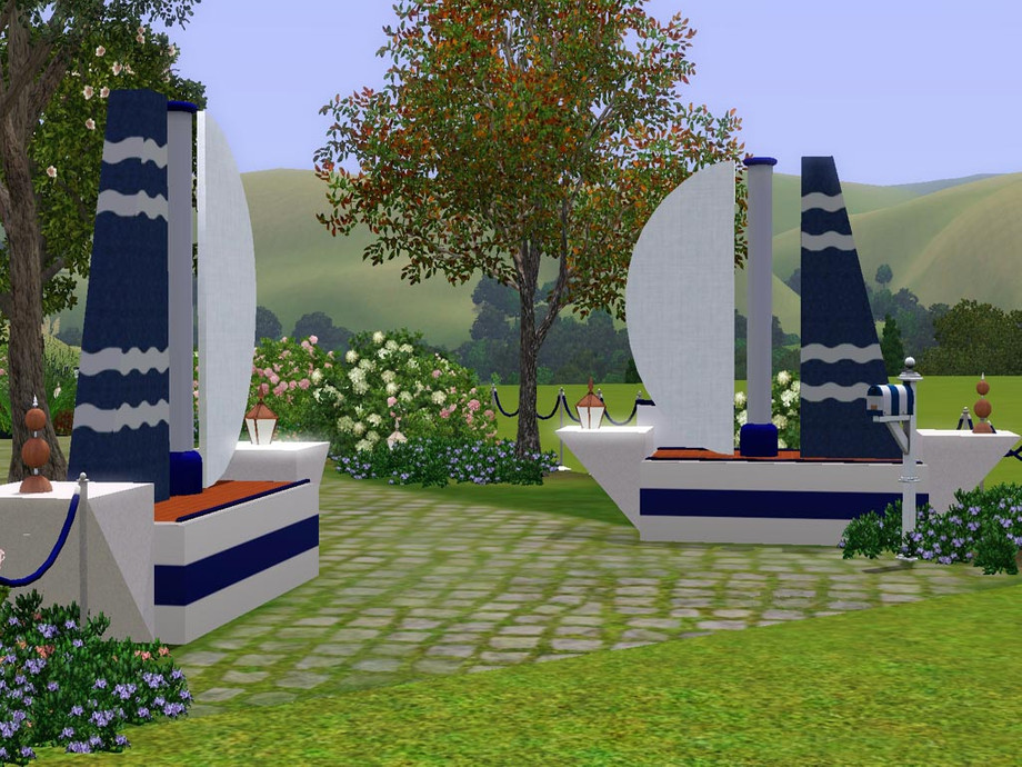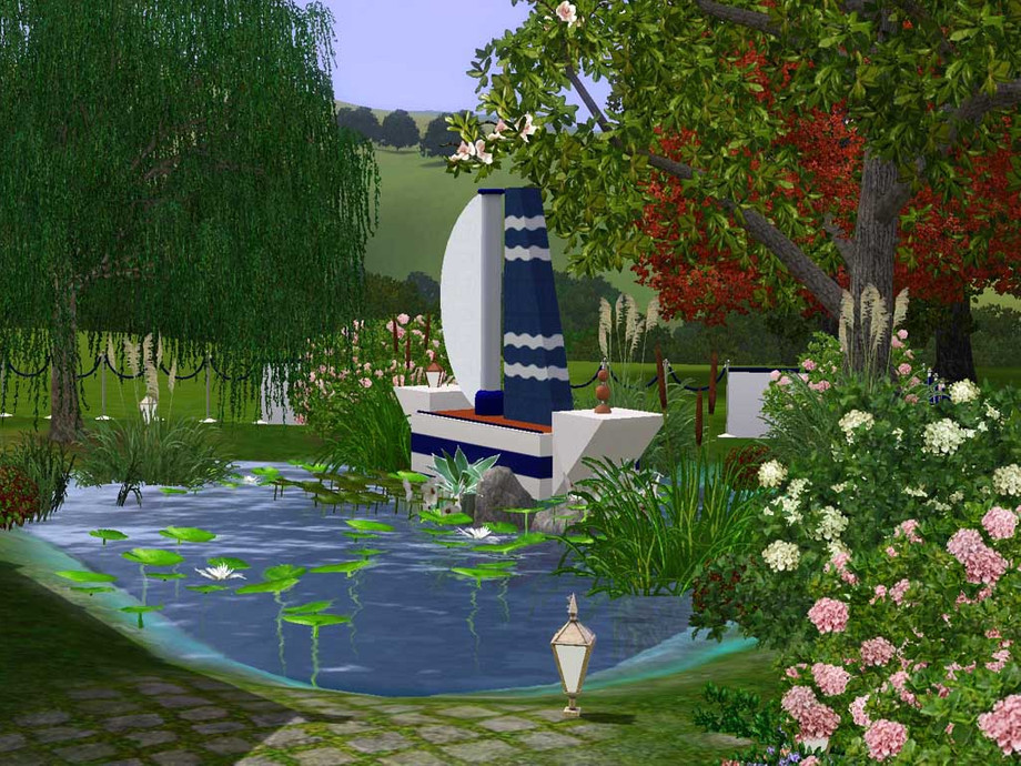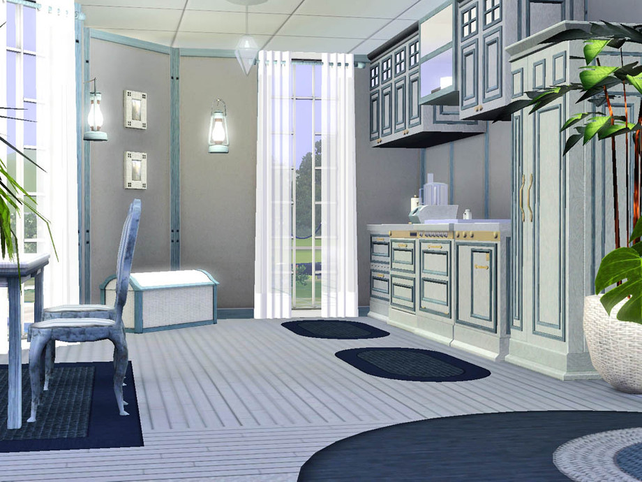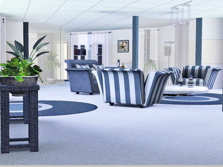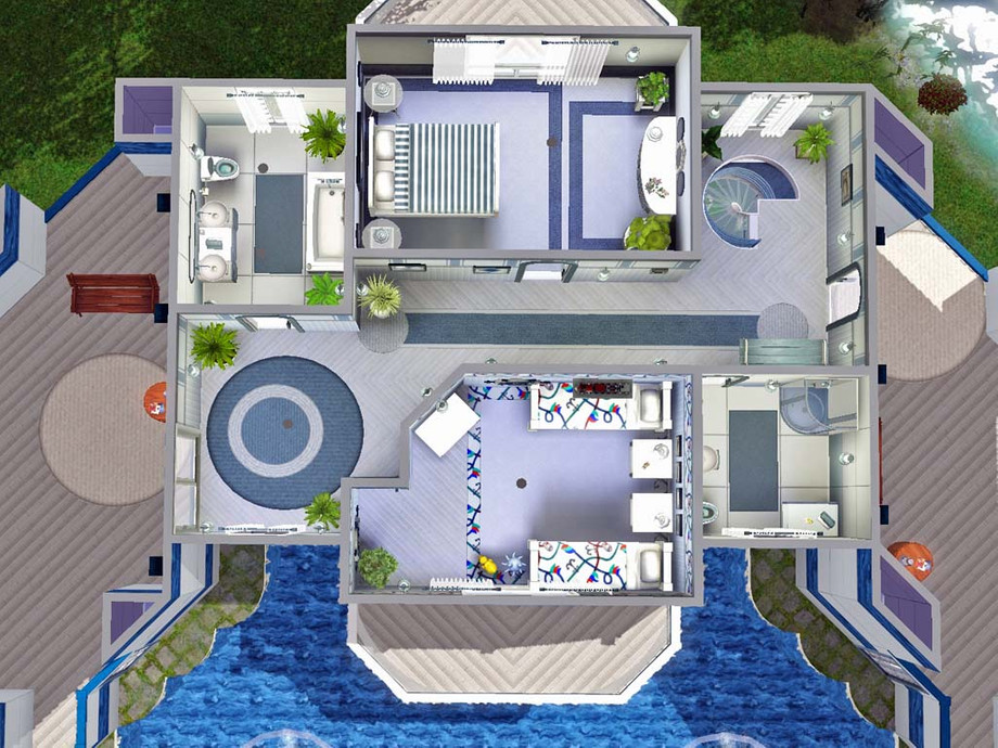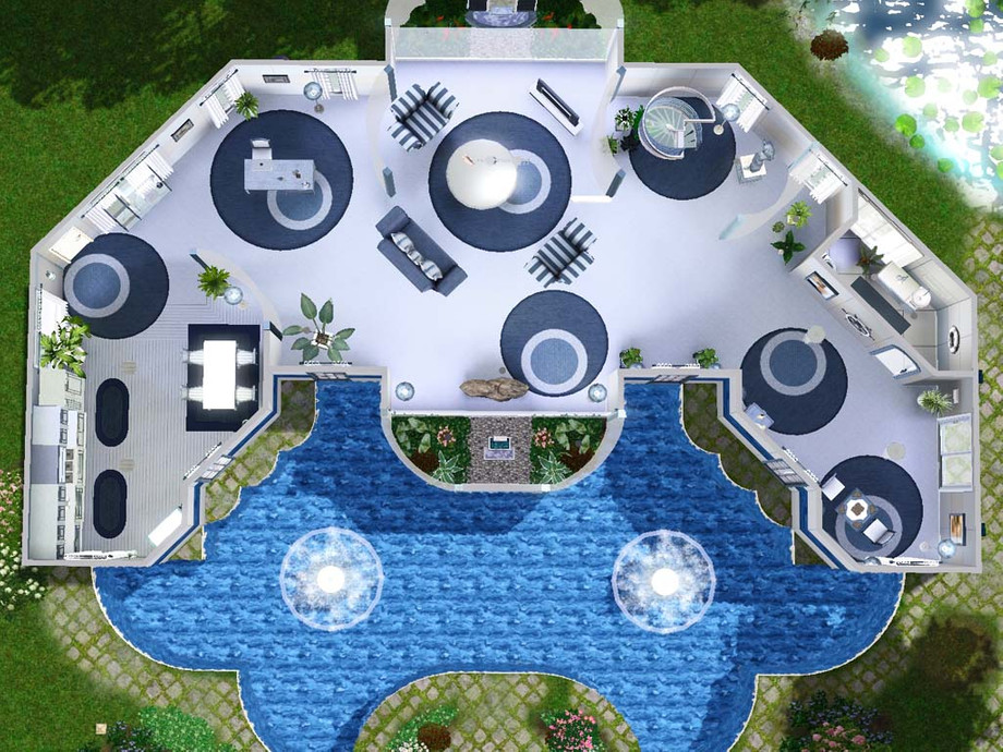 A nautical theme for this atypical house featuring 2 bedrooms, 2 bathrooms, a kitchen, a dining room, a living room and a study. In the garden your Sims will enjoy a pool, a hot tub and a pond with fishes.