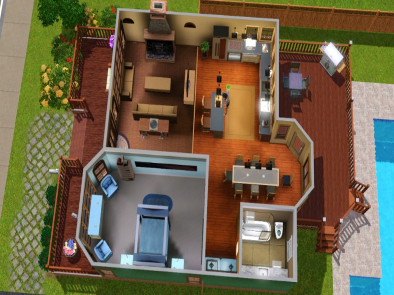 1 Bedroom 1 Bathroom. Perfect home for a couple or a single sim. Comes with Washer and Dryer. Pool and Hot tub. Enjoy :) Made with All expansion packs (Ambitions, World Adventures, Late night, Generations, and Pets) and High End Loft.