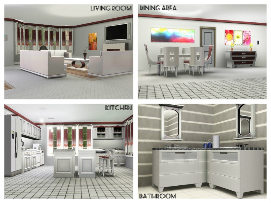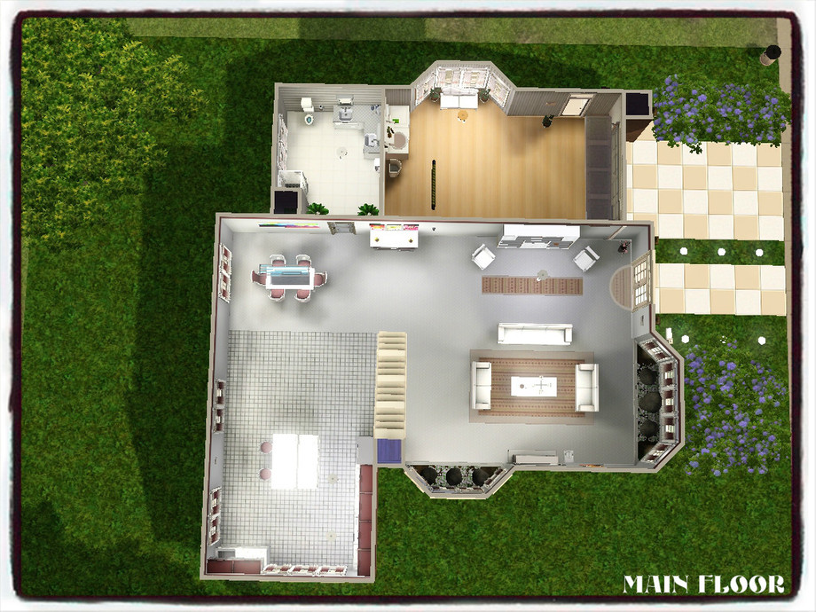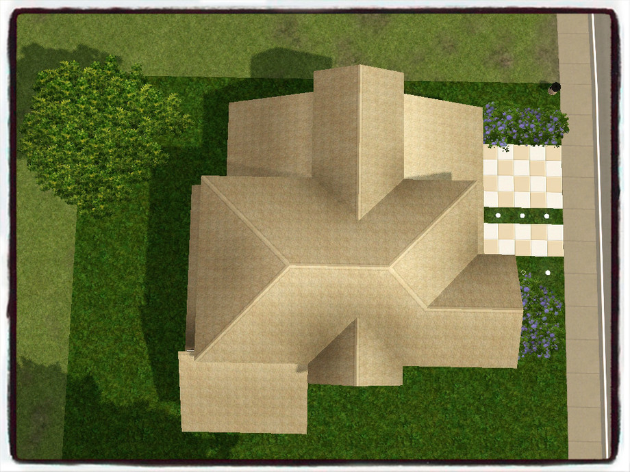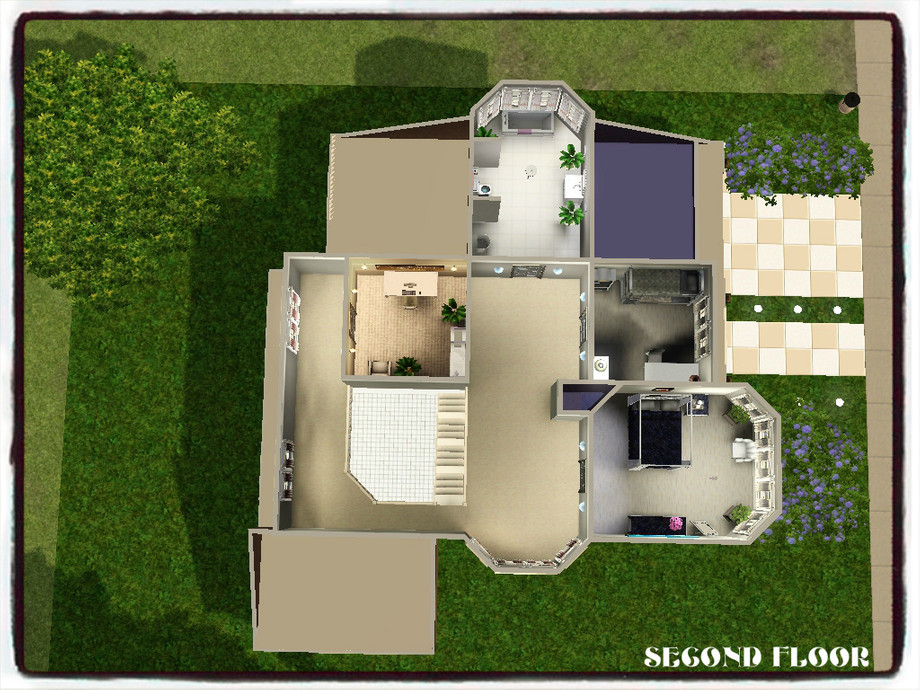 In my game, this home is located at 155 Horseshoe Bend in Moonlight Falls. You can place it on any 30x30 flat lot. There are two bedrooms, two bathrooms, one-stall garage equipped with a washer and dryer, an open floor plan with a nice sized living space and kitchen. There is also an extra room on the second floor that I made into a computer room/small reading nook.