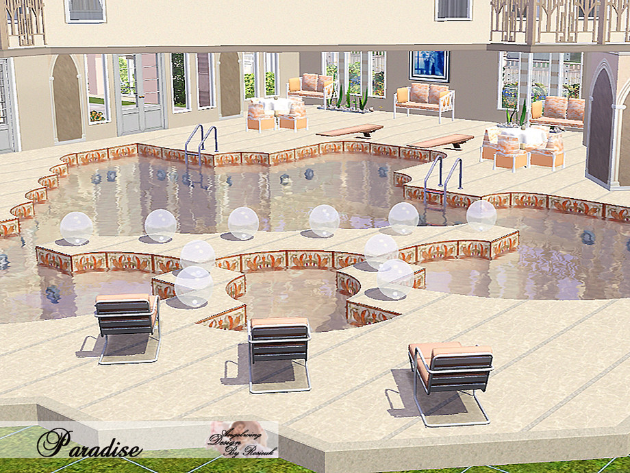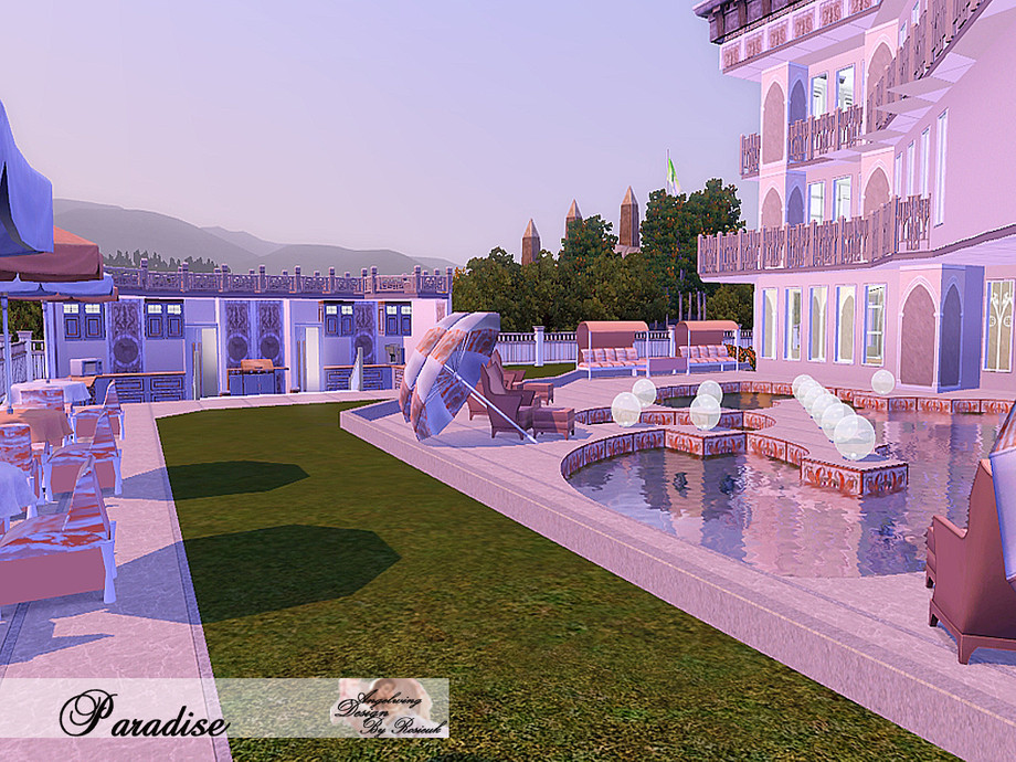 The swimming pool is one of a kind; also there is a barbeque full area with everything your Sims would need, eating and sitting area too, there is an outside gym and hot tub in a beautiful area.