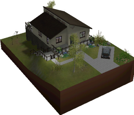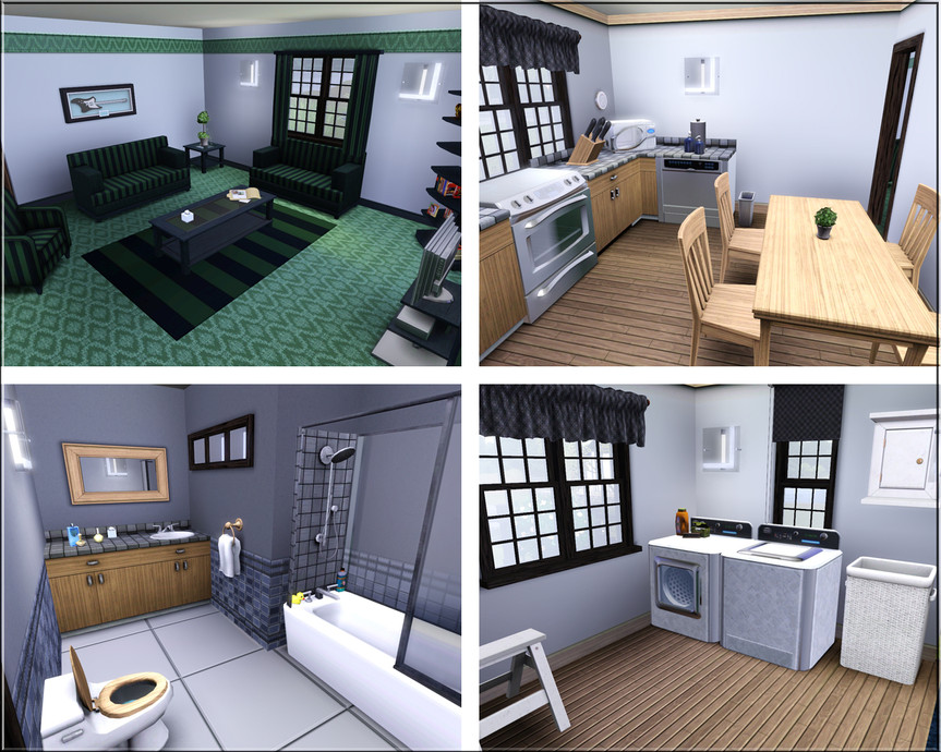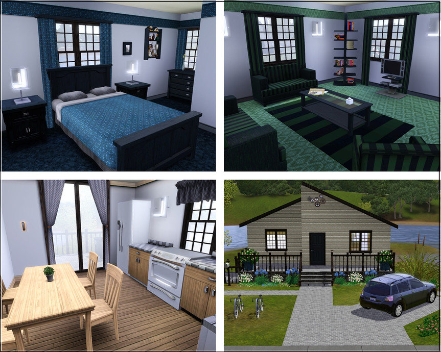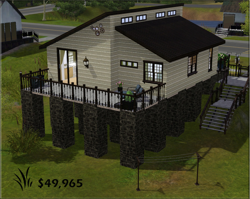 Modern one story, one bedroom home on stilts at the river's edge. With bathroom, kitchen, living room, utility room and balconies. Parking space and bike racks. Made for the sloping Lots on Poker Flats Drive in Twinbrook. The Lot has been tested and no cc used. You will need WA, HELS and Ambitions for all the items to show up correctly.