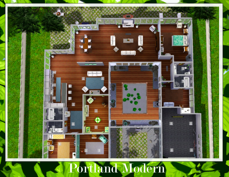 Portland is a city that absolutely fascinates me in so many ways, and it's unique architecture style is one of them. Portland houses are famous for their signature atriums and bringing the outside in to their homes. This house, my first in a series of unique Portland-style houses I will be uploading, features an atrium with a rock garden and pool, three bedrooms, two bathrooms, a playroom, an office, a kitchen, a living room, a family room, a one car garage with space for bicycles (another Portland feature), and a large yard with an outdoor dining table, lounge chairs and a barbeque. The playroom, office and garage could also easily be transformed into extra bedrooms, if needed. Please, do not re-upload, and enjoy!