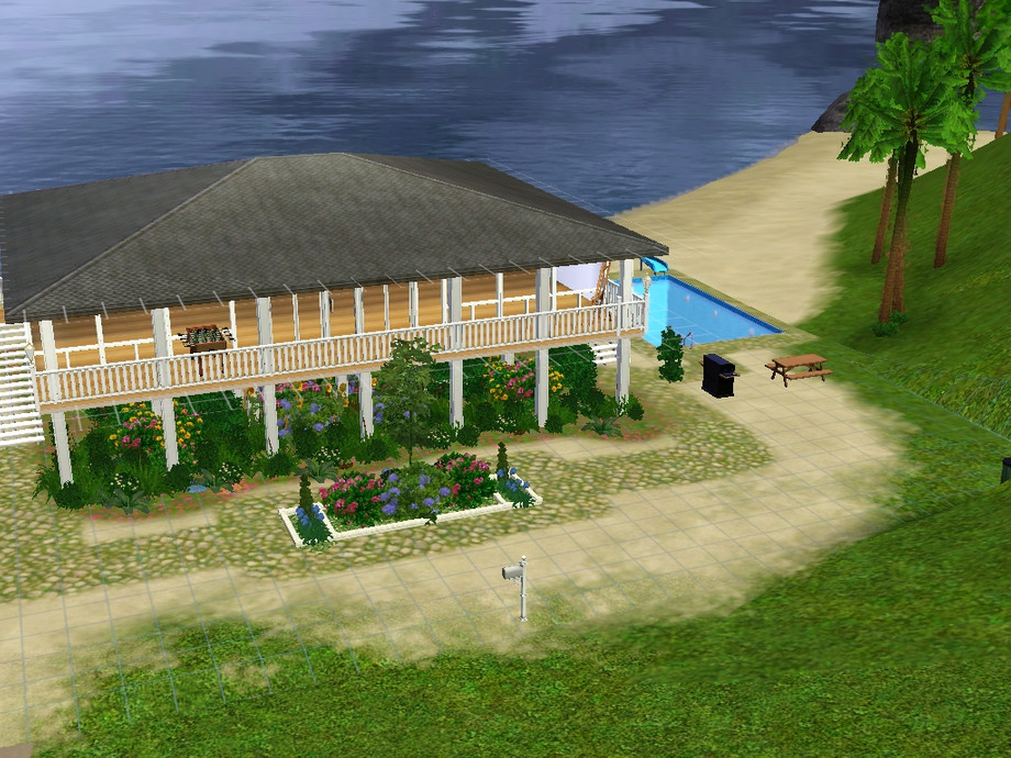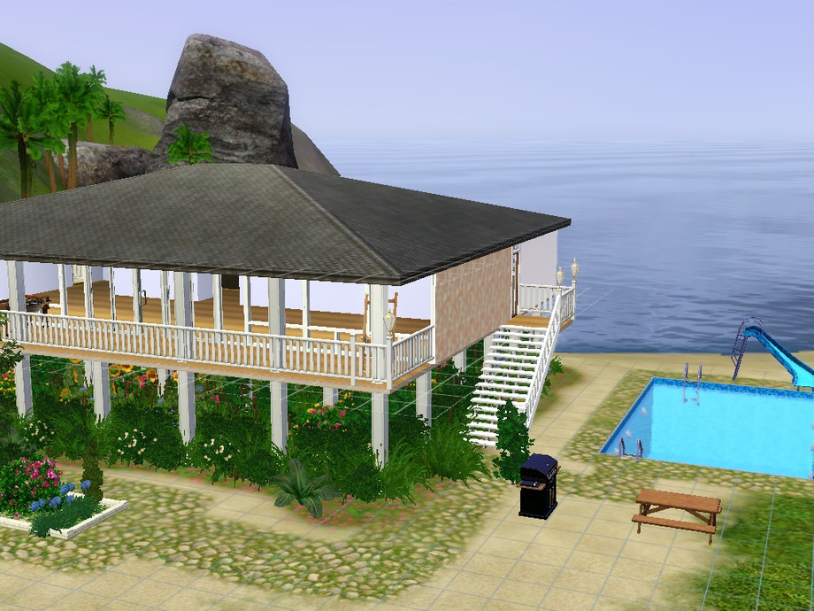A Modern Raised Beach house,perfect for any sim. This property did used to be built on a swamp,hence the "raised" part. But miraculously,the swamp dried up,leaving a beautiful wild garden underneath. Cheap, affordable, but stylish. There are three bedrooms, large open plan kitchen/ living room, two bathrooms, and a study and gym areas. Beautiful gardens below the pillared house. There is even a deck for your sims to relax on, or maybe sunbathe, even stargaze. Oh,and lets not forget the pool.
