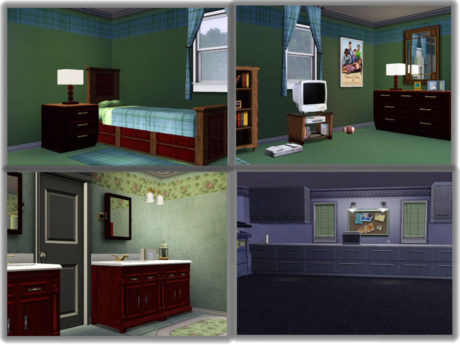 The ground floor has a front entrance foyer that leads into the living room/family room. There is an entrance through sliding glass doors on to the patio area and back yard. The formal dining room is off the living room and there is a door that leads to the side entrance next to the garage. There is a family computer room off the kitchen. Down the hall is a Master bedroom, a teen son room, and the family bathroom. This home will be an easy play for your Sims. There is room for expansion and a pool if desired.