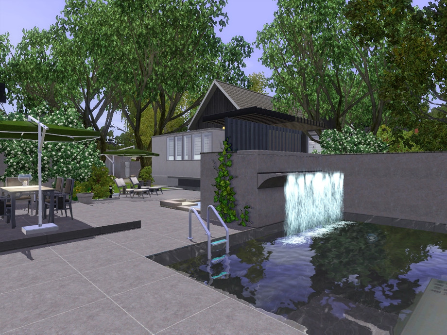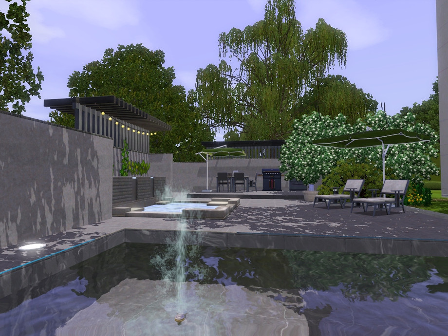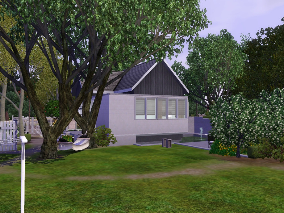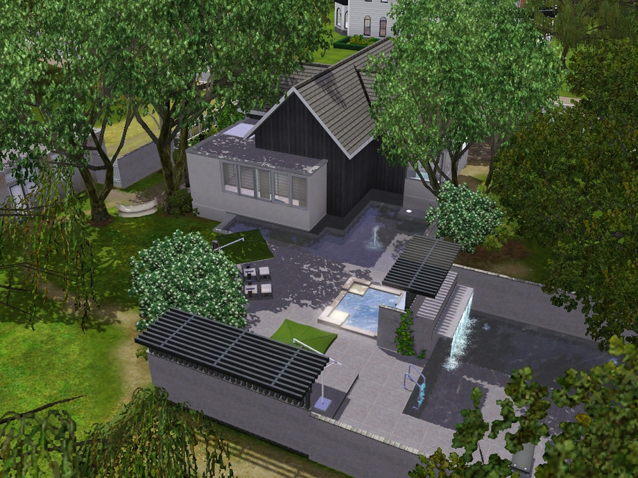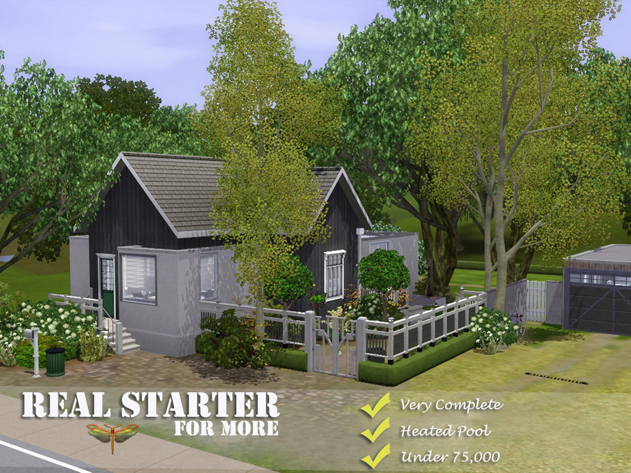 The end result of the Real Starter set of three. This lot is still the same in the core. I have added on to it, did the landscaping and fulfilled every wish my testing Sims had. Complete with pool, BBQ , hottub, garage and second bedroom for a roommate or a baby. The perfect place to stay your entire Sim life.