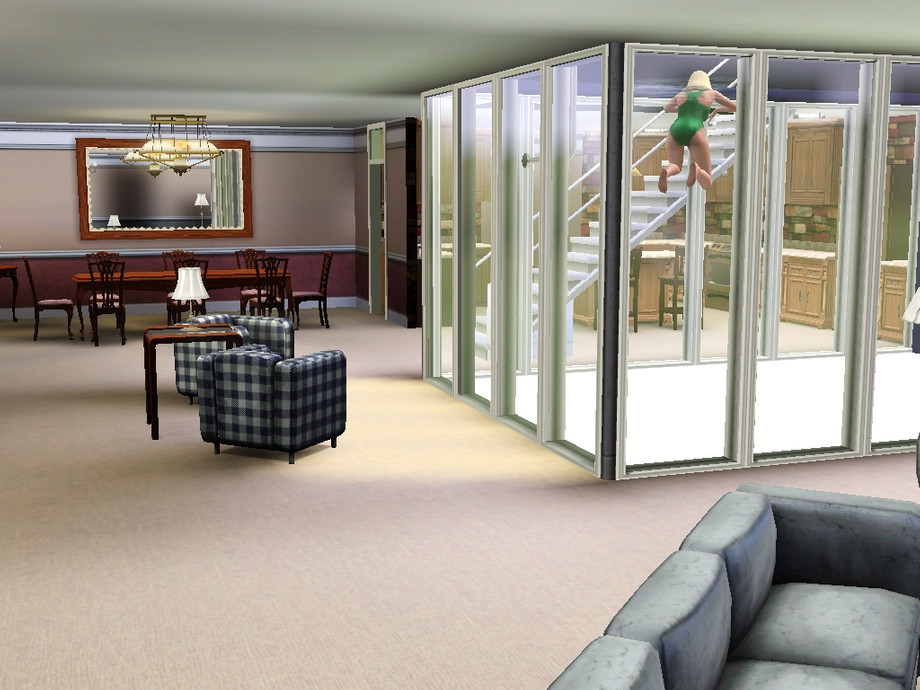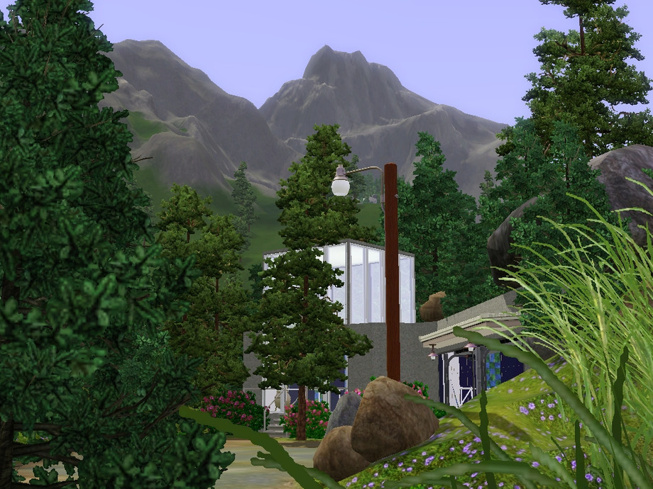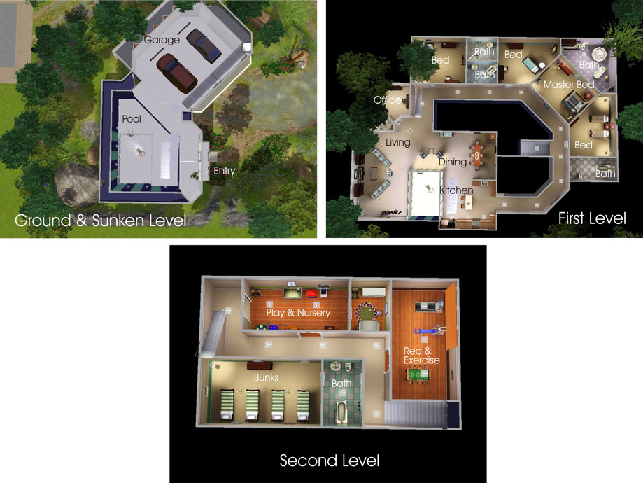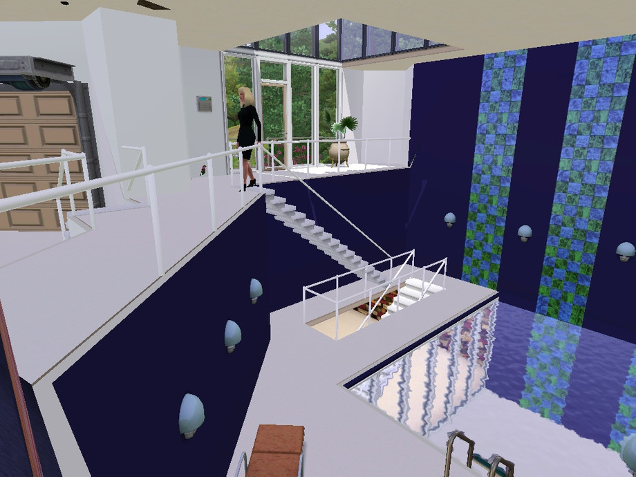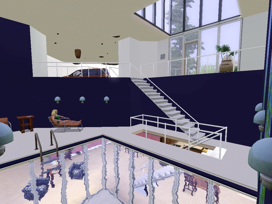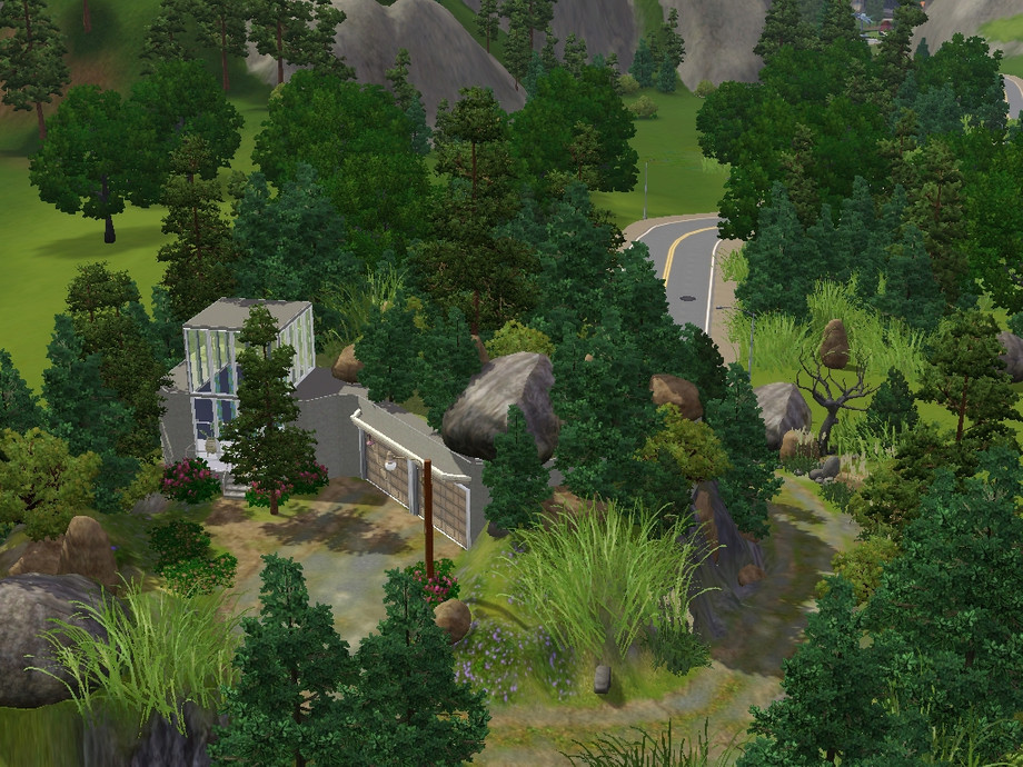 The first day on the job this young little entrepreneur is wondering if it's a wise business move to service these clients. Experience has not yet taught him the short-sightedness of first impressions. For up around that imposing bend is a very plushy arrangement. Spacious and up-to-date too, I might add. Just because you may take drastic measures to seal out all visible evidence of your existence and you are more than a bit preoccupied with surviving the big one doesn't mean you live in a hole in the ground....well, in a manner of speaking. It's not so much the idea of the hole but what you put in it. In and around this hole is a 2 car garage, swimming pool, and many a modern accoutrement. With five bedrooms and at least as many bathrooms even the largest of sim families could nicely subsist here as long as they can get used to not seeing the street or the light of day when they wake up.