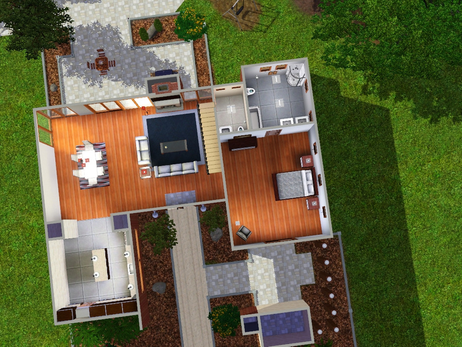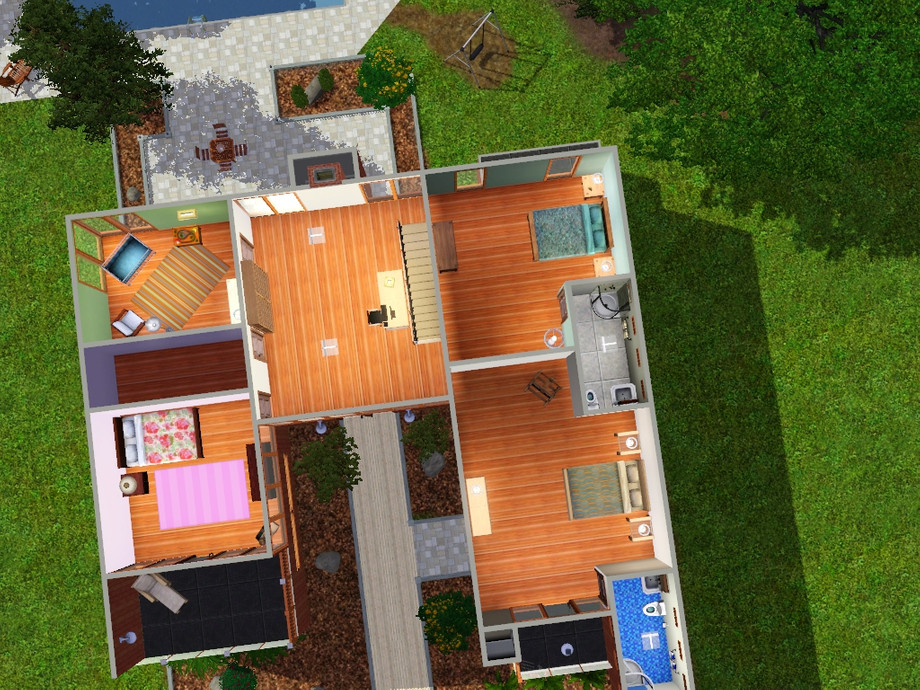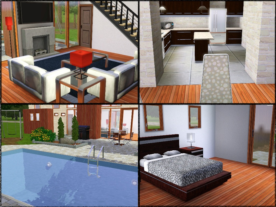 A lovely modern house that I am sure your Sims will love. It is fairly large and fully furnished with 5 bedrooms and 4.5 bathrooms. There is a pool outside two parking spaces, outdoor eating area, and is fully landscaped with a bit of room for a garden if you wish. It is set around an open floor plan with plenty of windows to let in light. There is one master suit but two other suits on the second floor.