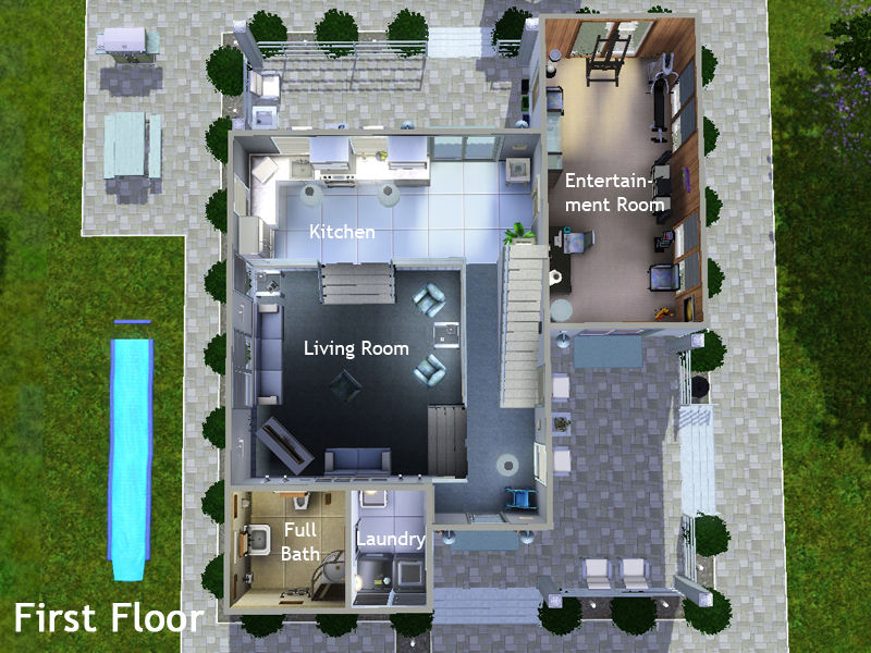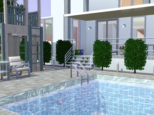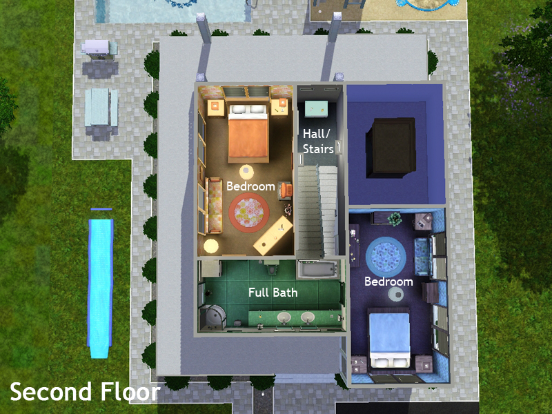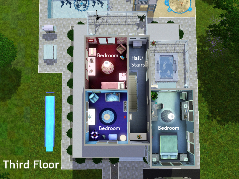 This modern style 3-story house comes fully furnished with a retro theme. It has 5 bedrooms, 2 baths, a kitchen/living room area, an entertainment room, a laundry room, 2 balconies off the third floor, a hot tub and a kids area and pool out back. No CC. It has been play-tested. Originally built in Barnacle Bay at 27 Coral Flats.