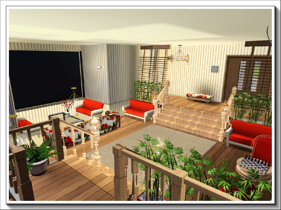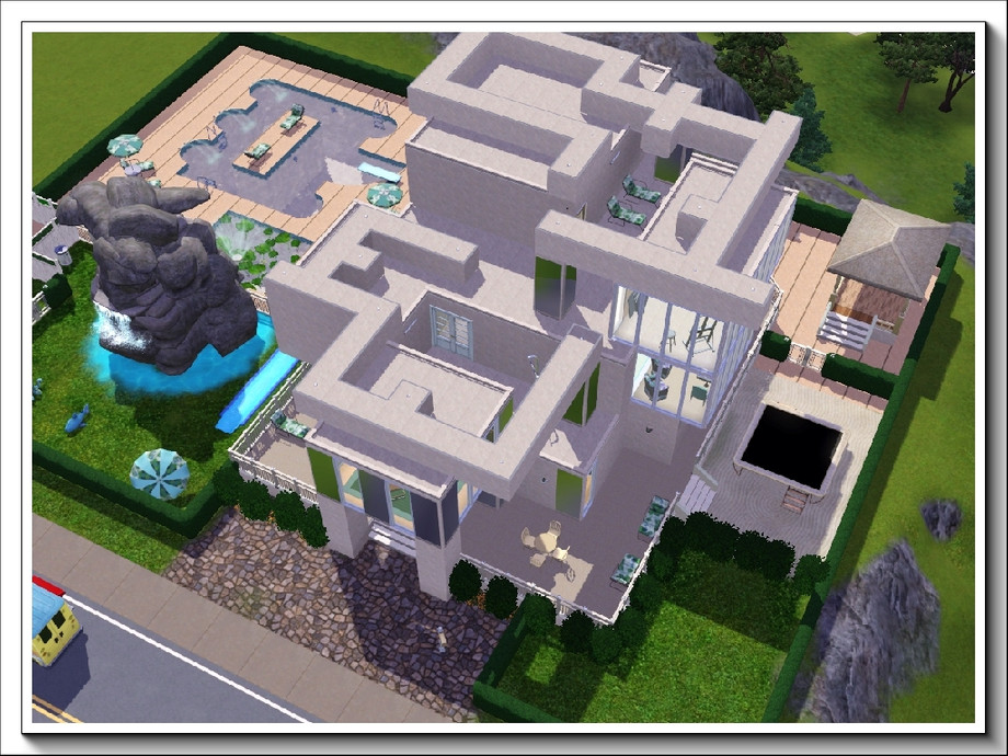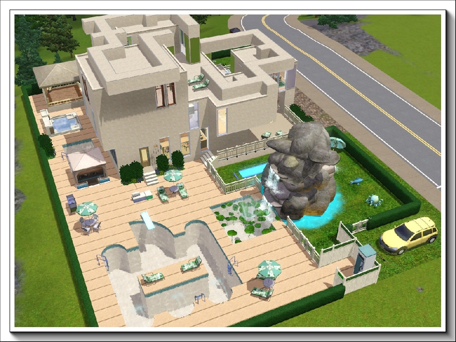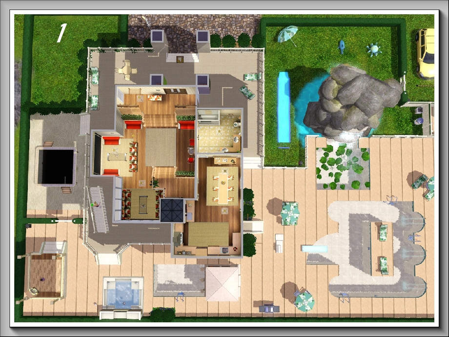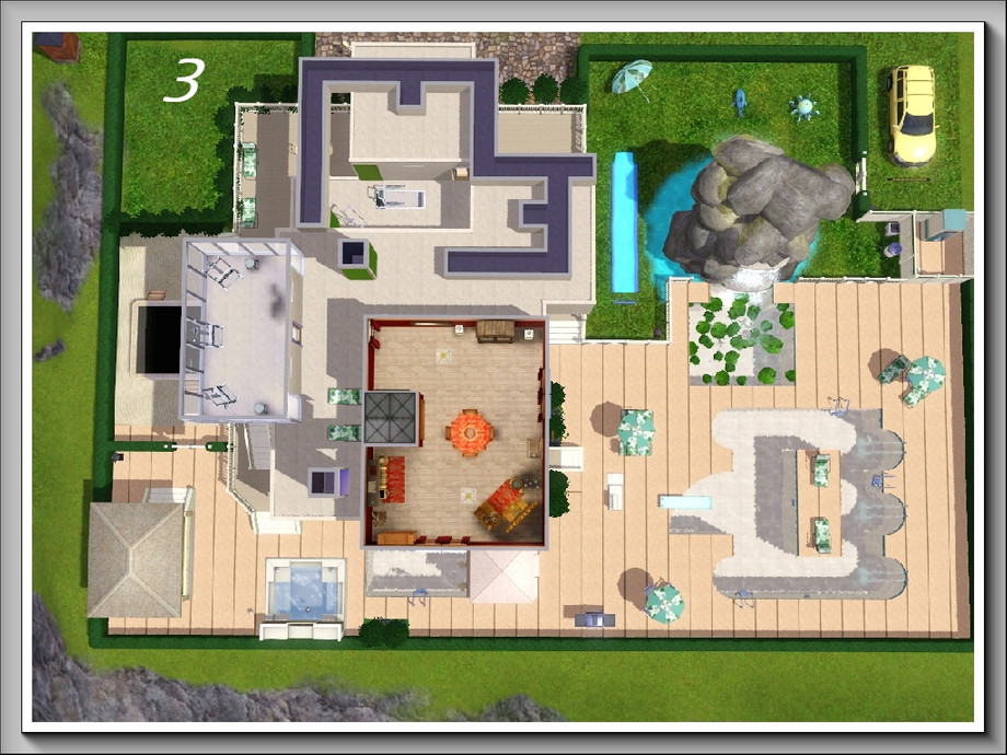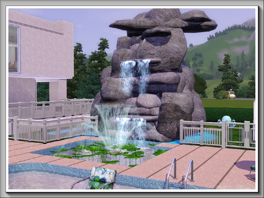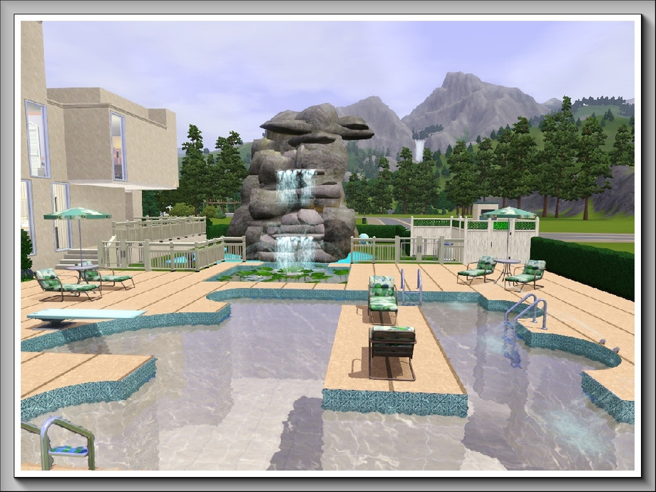 Rockpools is a modern, 3storey, 3bedroom/3bathroom summer residence with the main emphasis on enjoyment of water activities; it boasts a huge swimmingpool, a lily pool under the waterfall that flows down an enormous rock pile, a separate pool bar for adults and an outdoor hot tub. These are complemented by a covered dance pavilion with jukebox, a BBQ grill and plenty of poolside seating, both for relaxation and taking meals; there is also a one-stop 'bathroom' at the rear of the pool deck. A waterplay area is provided for younger Sims [or the young at heart] . . and for the more energetic there is a large trampoline in the side garden. All these areas are fenced with low hedging to keep roaming animals off the premises!