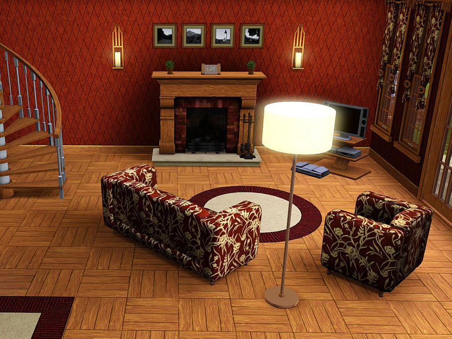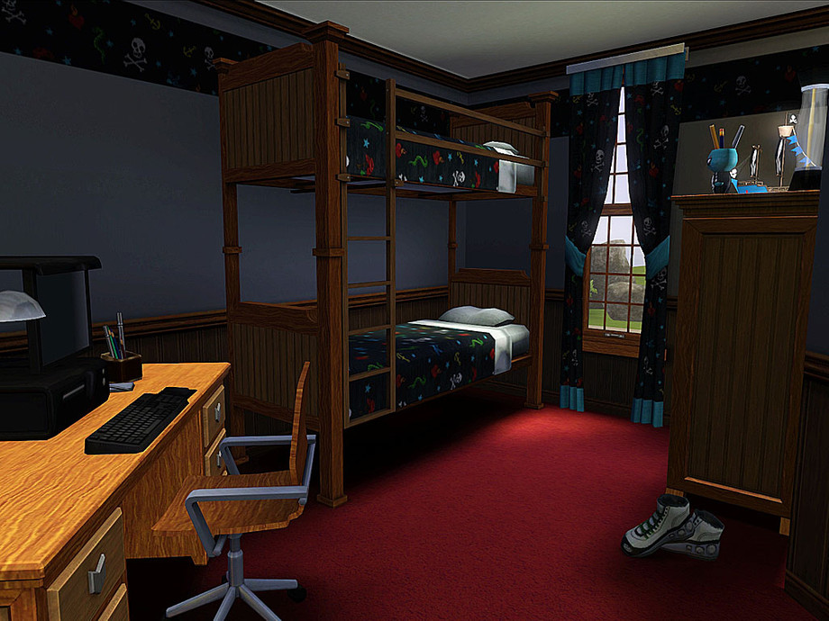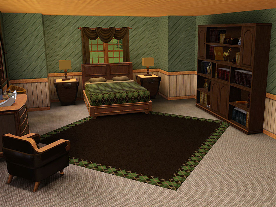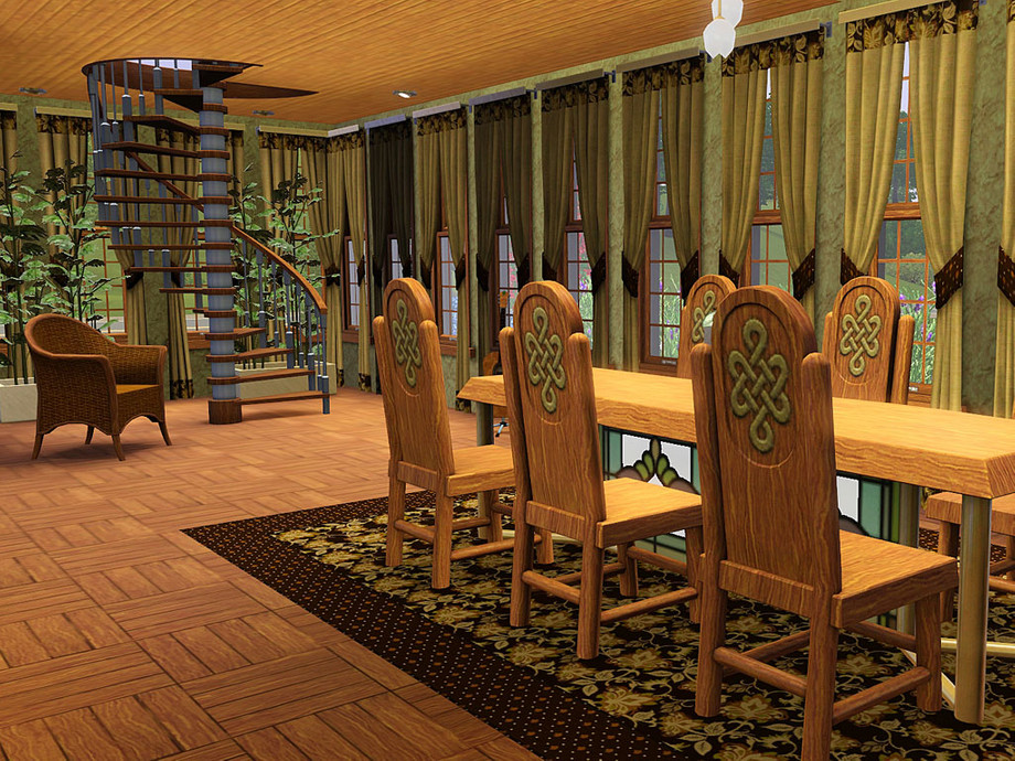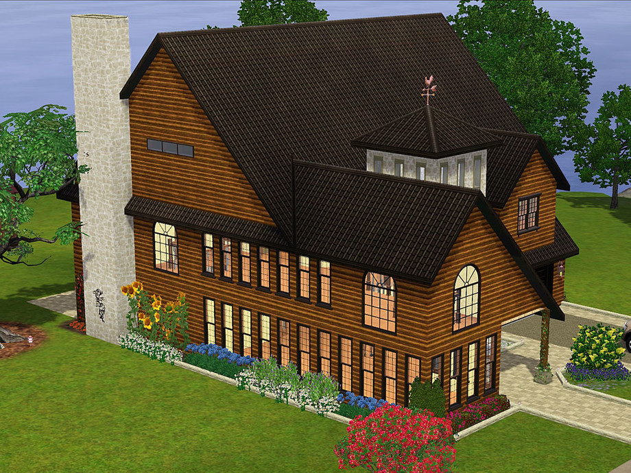 Rowen is a rustic lot with lots of natural charm. Nature-loving sims, or perhaps adventurers, would appreciate the decor in this home. Earthy colors were used throughout, giving the home a warm, casual feel. The exterior is a combination of log and stone. The tower at the center of the structure draws the eye to the entrance. The exterior is landscaped with various plants and flowers. There is even a treehouse in back ready for the little ones' imaginations. A hot tub awaits the adults on the patio, along with an elegant grilling area, table and chairs. The first floor contains the garage, basement entrance, modern laundry room, full bath, dining room, family room, and large kitchen. The open floorplan makes socializing easy for your sims. Upstairs holds 4 bedrooms, one a master suite with bath and exercise nook, a pirate theme room for the boys, and a hearts and sweet things theme room for the girls. The nursery is decorated in a neutral wilderness theme. There is also an open area perfect for the kids to play or study together. The basement contains a full bath with a bright and bold fish theme. The rest of the basement is unfinished, waiting for your own decorating desires.