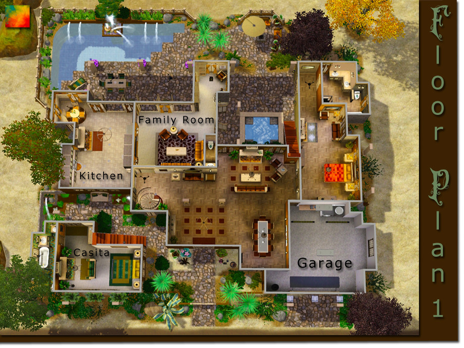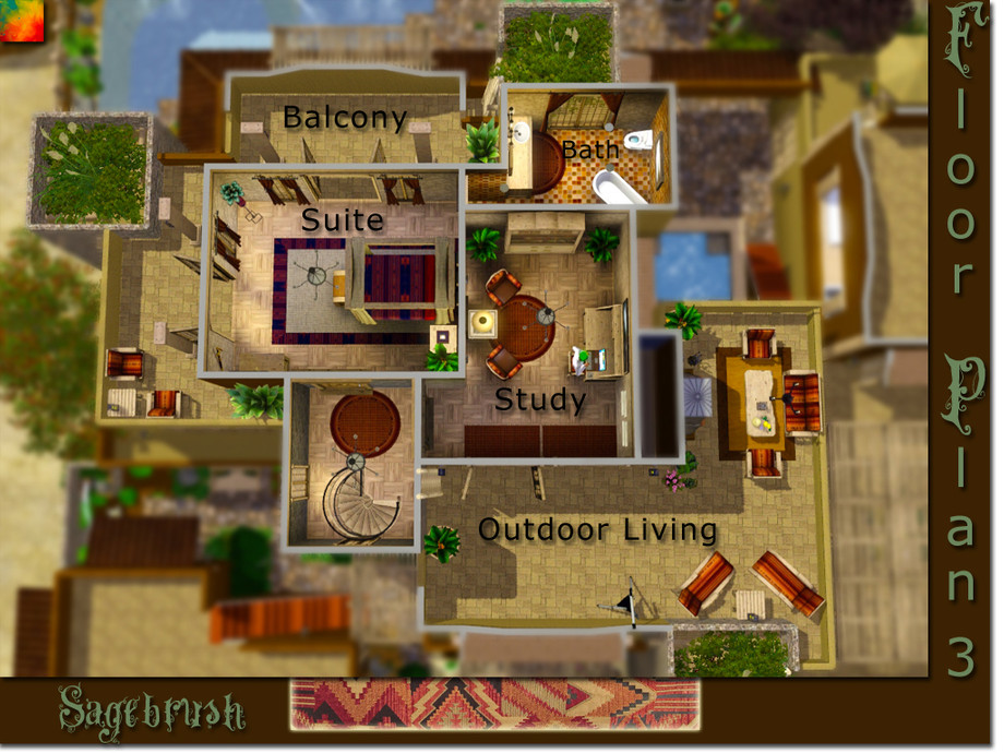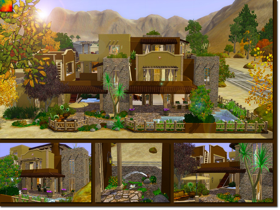 **Hi everyone! I know it's been a long time since my last submission, and I was just about finished building this when the Pets Patch happened. It nearly prevented this lot from being uploaded. After all this time it's finally sorted with help from the wonderful TSR staff and friends, thank you!** This lot was photographed in the Los Aniegos world created by Coasterboi@the exchange. This world appears to have been pulled and is no longer available. You can place this lot on any size 30x30 or larger, but I recommend it being a desert lot or the grounds will be green and very un desert-like. It looks very nice in Appaloosa Plains. I play tested this lot to ensure usability. I use all EP's and Stuff Packs except for Fast Lane, and my game is updated to the latest patches. This lot is Fully Furnished and comes equipped as shown in the floor plan and screenshots. I used items from stuff packs, if you don't have them, default items will show instead. Many many thanks to the following TSRAA Artists for allowing the use of their amazing items: Abuk0, Alex_Stanton1983, Ayyuff, CycloneSue, Freemousse, Gosik, JeziBomb, Matomibotaki, Mutske, Pralinesims, Spitzmagic, Wolfspryte. Thanks to Luna@SimsLulamai for the use of her wonderful rustic ladder! http://lunasimslulamai.jimdo.com/ Thanks so much to JaeDub@TSR and MaddenPro@TSR for their extra eyes! Thanks also to Ziggy28@TSR for all the advice!