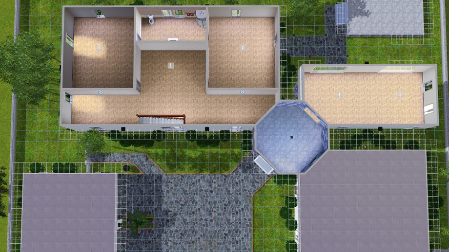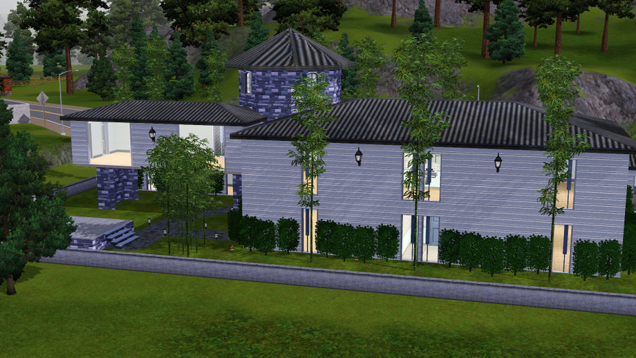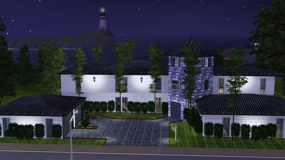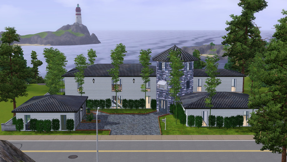 This home has 3 bedrooms and 3 bathrooms and features a turret entrance, 2-car garage, living room, dining room, and a backyard deck. Only the upstairs bathroom is furnished as shown in the picture, other than that it is unfurnished. The third story of the turret is inaccessible but I put four lights up there to give it a bit of style. The other feature of this home is the right hand wing of the turret - it is suspended by pillars in the back and does not have a first floor. At any rate - check it out and I hope you like it! It is currently my personal residence for my Sim!