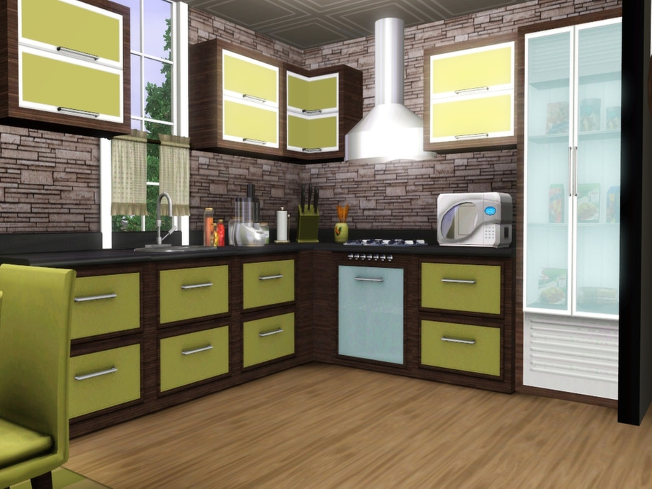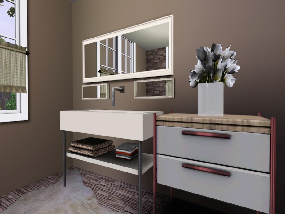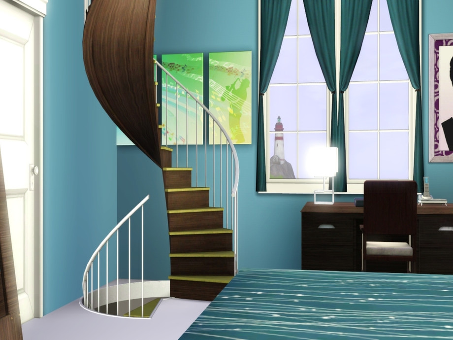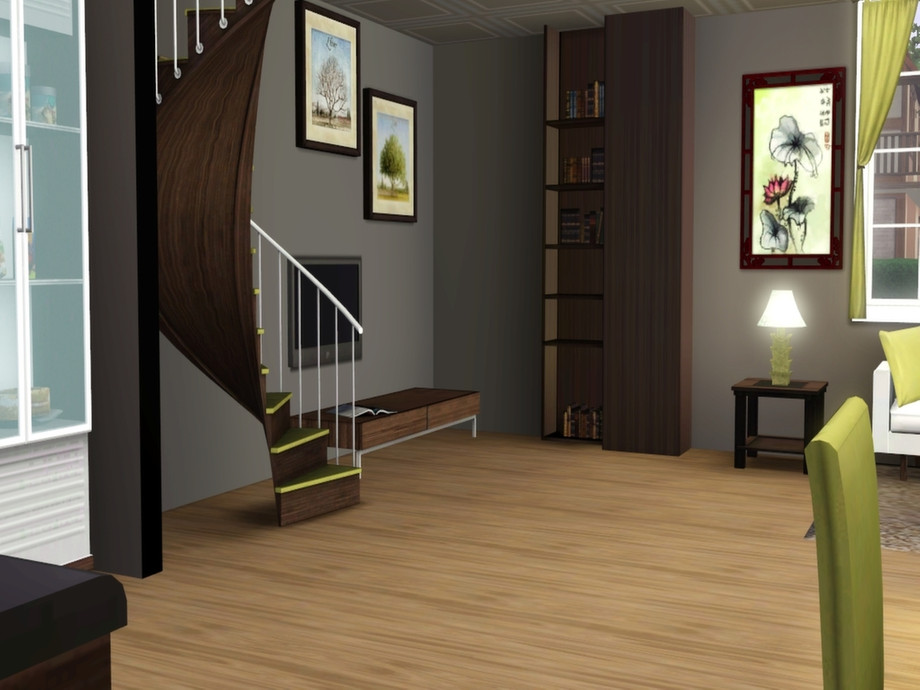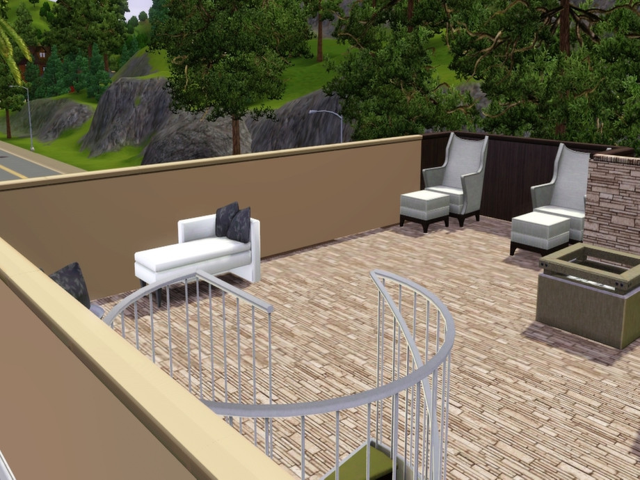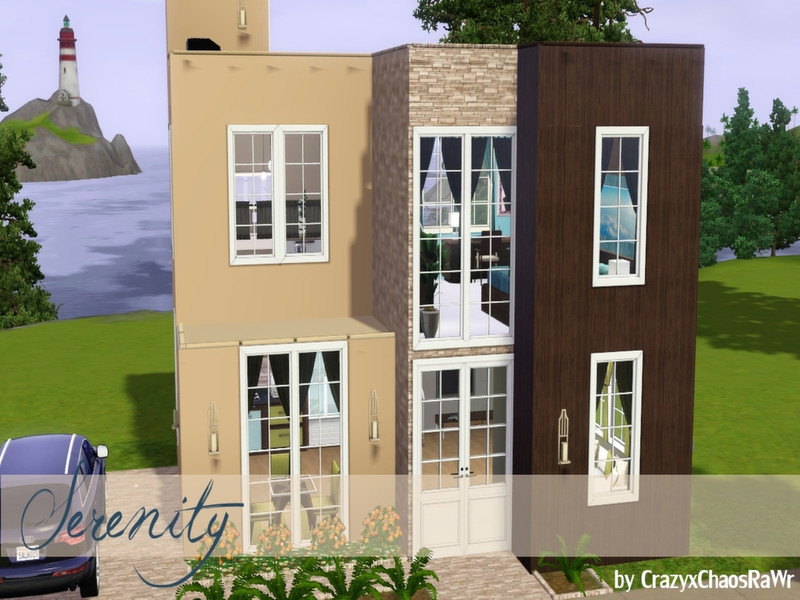 This small, efficient, one bedroom, one bathroom home is perfect for a young Sim wanting a fresh start. With dark bamboo throughout the home and splashes of olive green and soft grey to tie it all together, Serenity is a modern must-have. A one car parking spot, open lower level floor plan, and top deck with a lounge and grill give Serenity curb appeal and style.