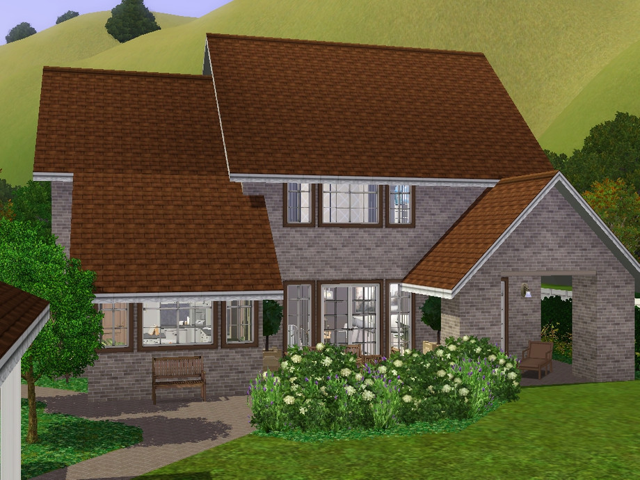 A cottage family house with living and dining area, kitchen, separate study, 3 bedrooms (master bedroom with en-suite bathroom), a bathroom and an indoor garage. Outside is a second garage with porch.