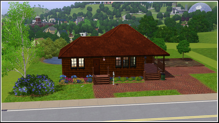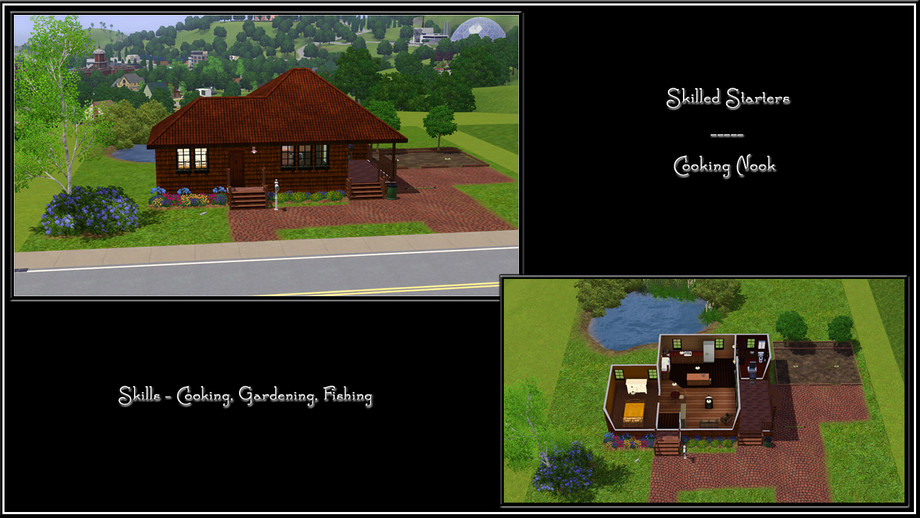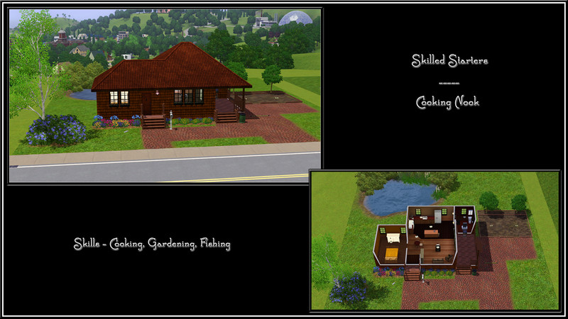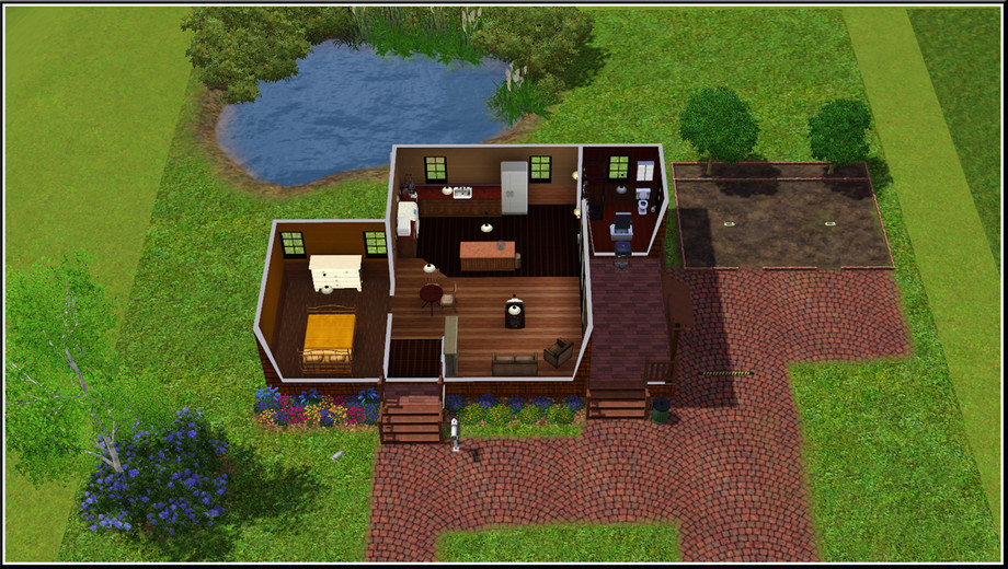 Starter home for Sims who need to build skills in cooking, fishing and gardening. For Under $20000 this traditional house has 1 bedroom 1 bath, full kitchen, eating area, living room, Tv, bookshelf with cooking books vol. 1/2 and gardening books vol. 1/2, 4 easy recipes and 3 fishing books. Backyard has deck with bbq, large started garden and pond. 1 car spot but no car.
