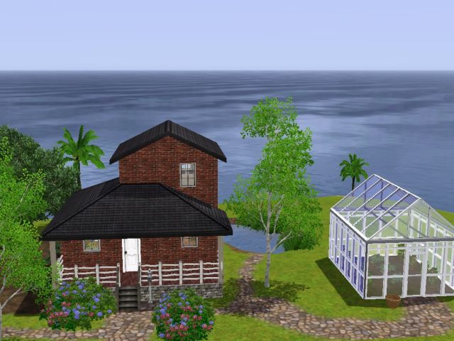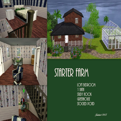 A farm for Sims starting out. 1 bedroom 1 bath ,study nook ,garden ,greenhouse and stocked pond.