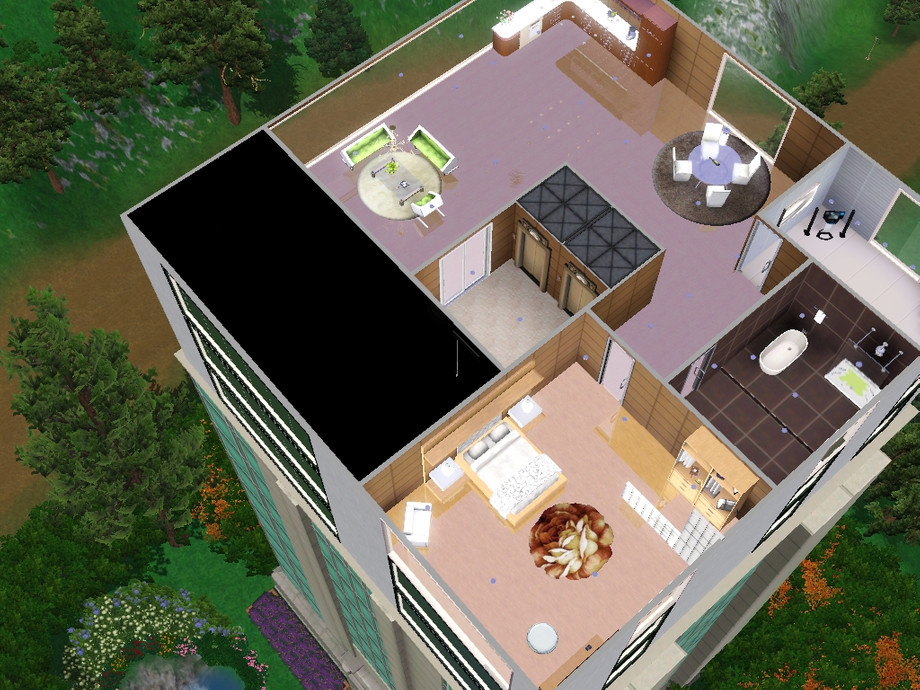 This apartment has- a well decorated bedroom, a bathroom,a study,a cozy living and a kitchen along with dining area. This modern apartment has an outdoor full of trees.Its also has a small waterfall,which increases the beauty of the apartment. This apartment is perfect for your single sim or a couple. Its just a perfect place for your sims