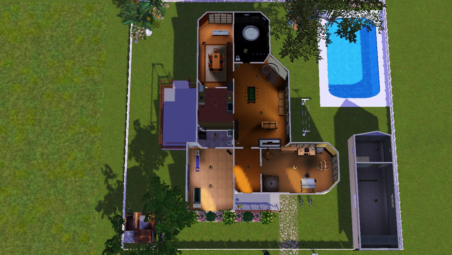 On the ground floor there's a small gym, a study, a living room, a kitchen, a dining room and two bathrooms. On the top floor there are two berooms for children and a master bedroom with a private bathroom. Outside there's a small garage, a laundry room and a pool.