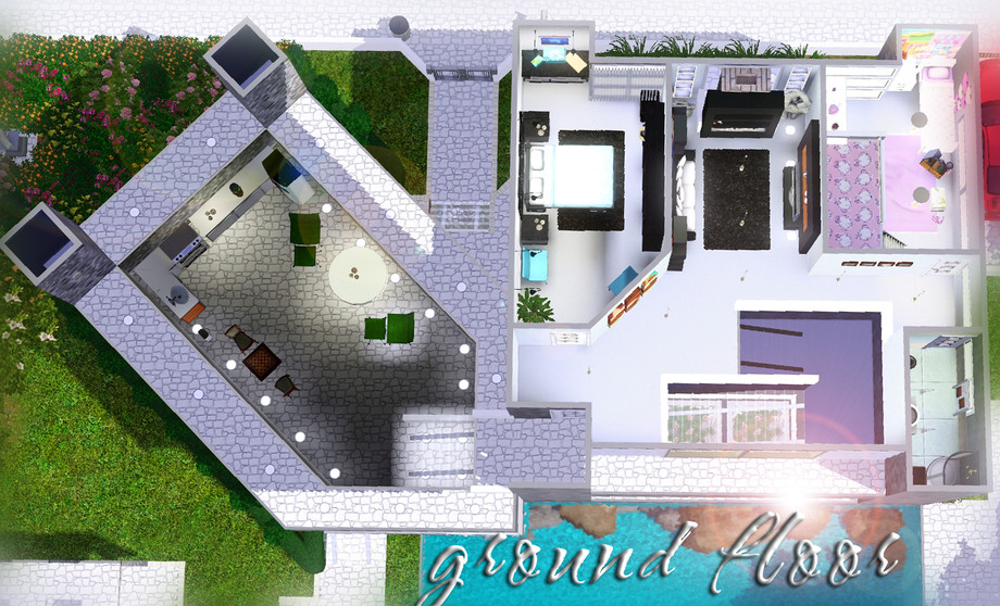 Sweet little house with two sweet big balconies, a nice garden, 2BE, 2BA, 2 living rooms and 2 kitchen, modern, all useful spaces, not too filled with stuff and not empty. Great house for a family with one child, but enough space for the second, with some minor changes that you can make, and not too big for only one Sim.