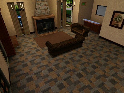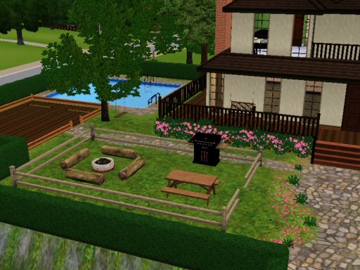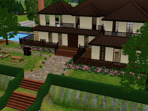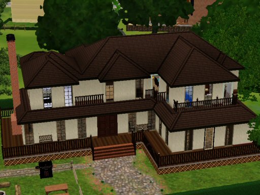 This dream house has three bedrooms, five bathrooms, a game room, very large kitchen/dining area, and relaxing living area with a bar. Do your sims love the outdoors? Well Tavern Hill is perfect with a cozy camp fire site in the front yard.