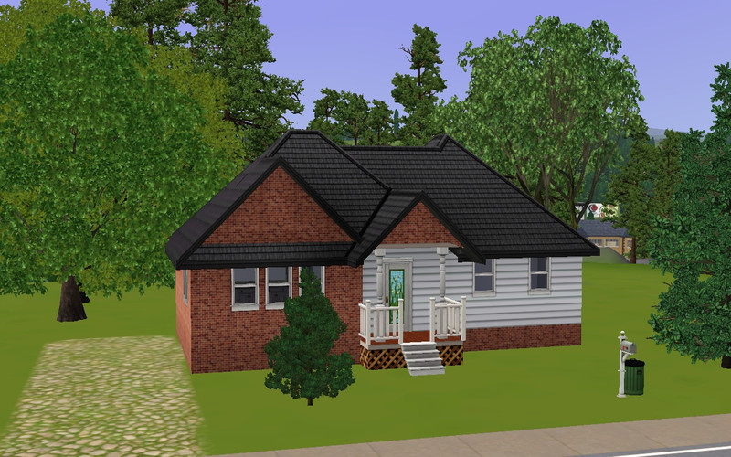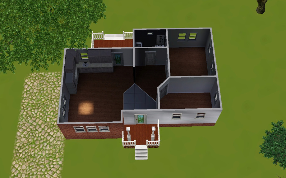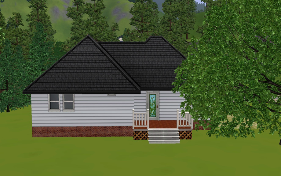 This perfect little starter home is painted with a simple white color throughout. It has a driveway, a small porch on the front and the back, a living room, a small kitchen, a dining area, two bedrooms, and one bathroom. It has a nice flow with an open floor plan, and it perfect for a single sim or a young couple ready to start their life, with plenty of room to expand!
