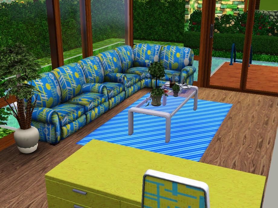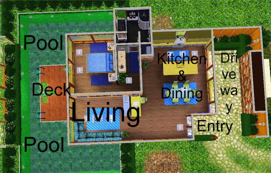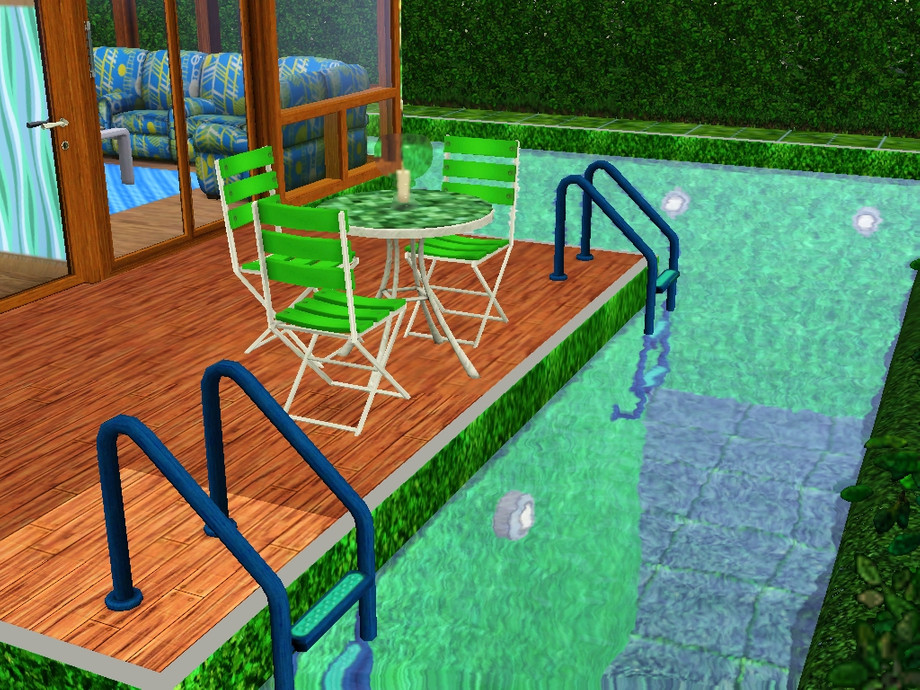 The deck gets its name from the pretty deck attached to the pool in the back of the house..both the living room and bedroom overlook the pool and deck..the pool surrounds the bedroom and living room..the house is done up in bright blues and yellows and has warm wood as its base..its has 1 bedroom and attached bathroom..