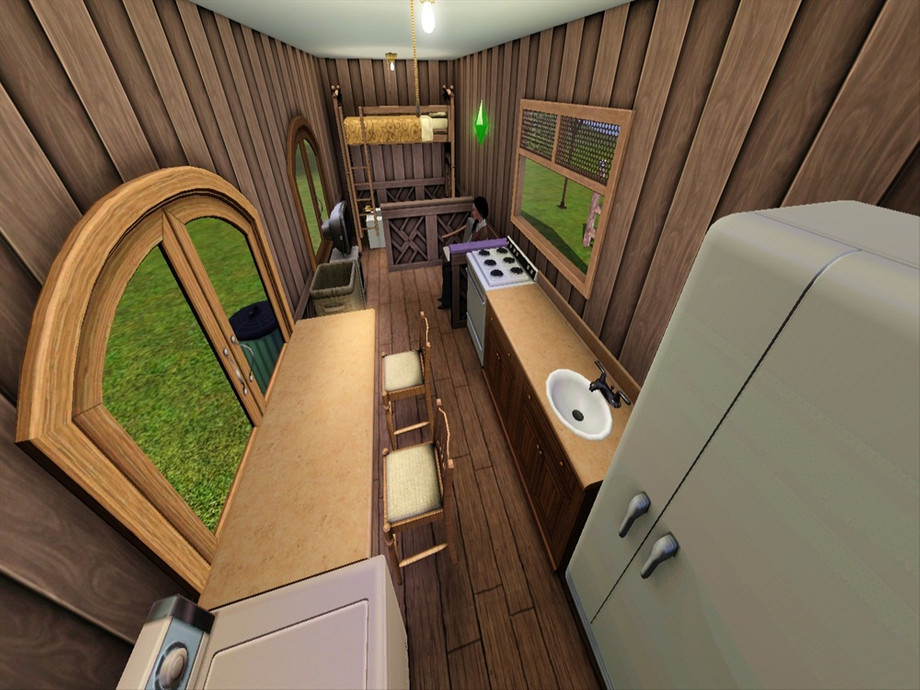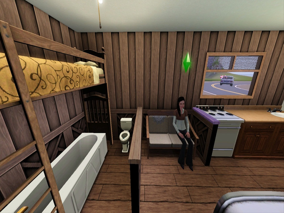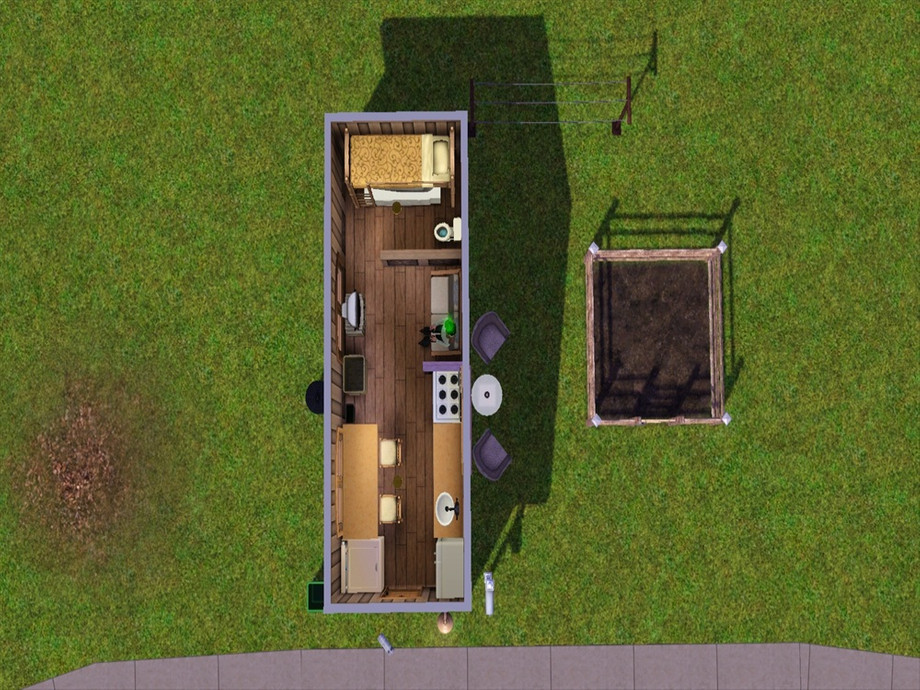 Hey Ya'll, I saw these tiny houses online and thought I'm gonna make one! So here is "The Lonely One". It's perfect for your loner sims! The bathtub actually works under the loft bed! I thought that was awesome lol. the only issue I saw when I play tested it was, when the sim ate, she ate at the couch or outside, b/c the bar is against the wall. But your sim can sit in both chairs, my sim was reading there earlier :). I was gonna put a table there, but I honestly didn't like the way it looked for what I was doing lol. So feel free to put a small table there if you like :) it will fit and you can have 2 chairs. I tested it to be sure. I hope you like this tiny home and It's super cheap and has all the basics that your loner sim will need! I had a blast making it and it was a challenge not to pull the walls out to make a little more room LOL. Enjoy! ~big hugs
