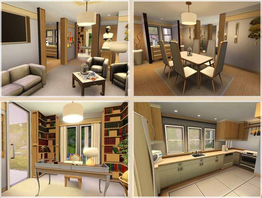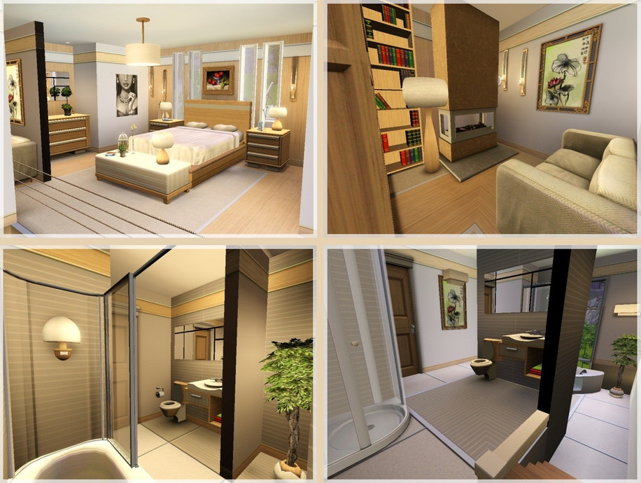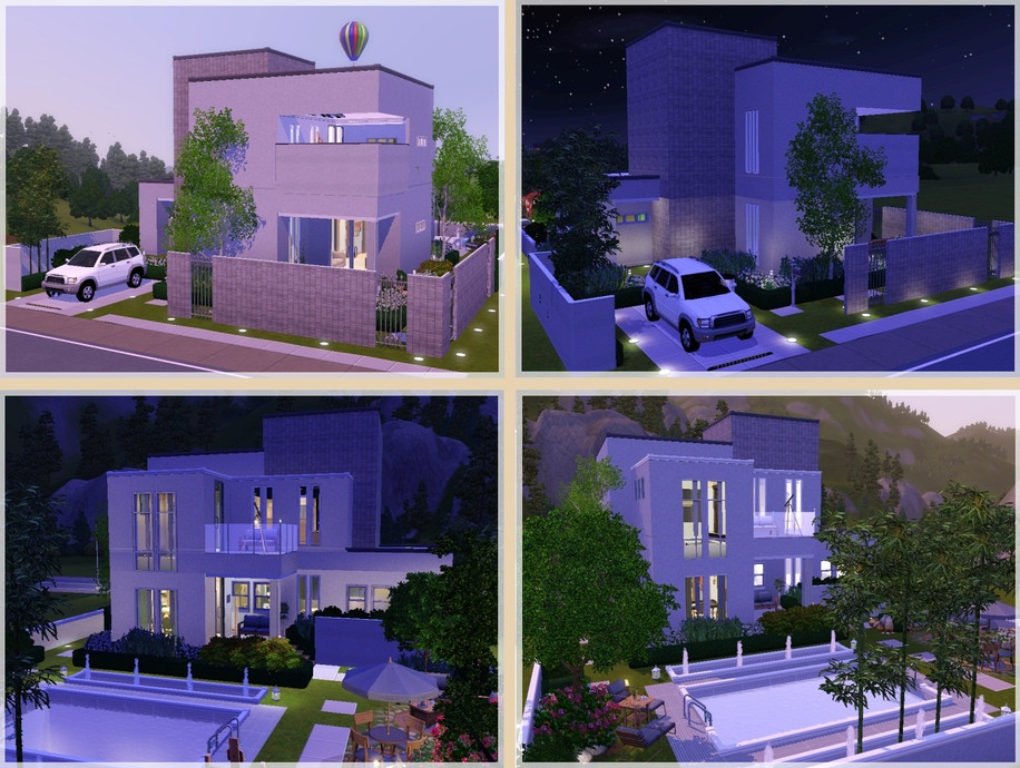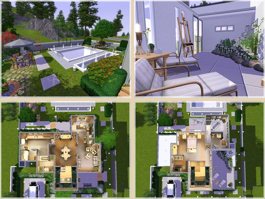 This lot is a re-creation from one of the Toyota prefab homes (Yes Toyota does make homes) Featuring simple architectural modern style, with wonderful surroundings and landscapes, as well as a pool lined with fountains. Interiors are simple and chic, which include a living room , a dining room, a kitchen, and a lovely planted staircase area which is opened to the dining room. It's a very natural home, with a balcony which is well planted and decorated. There is also a mini living area in the bedroom where your sims can warm them selves up in those cold days, and the master bath is just like a spa, with the tub over viewing the pool area. Very relaxing.