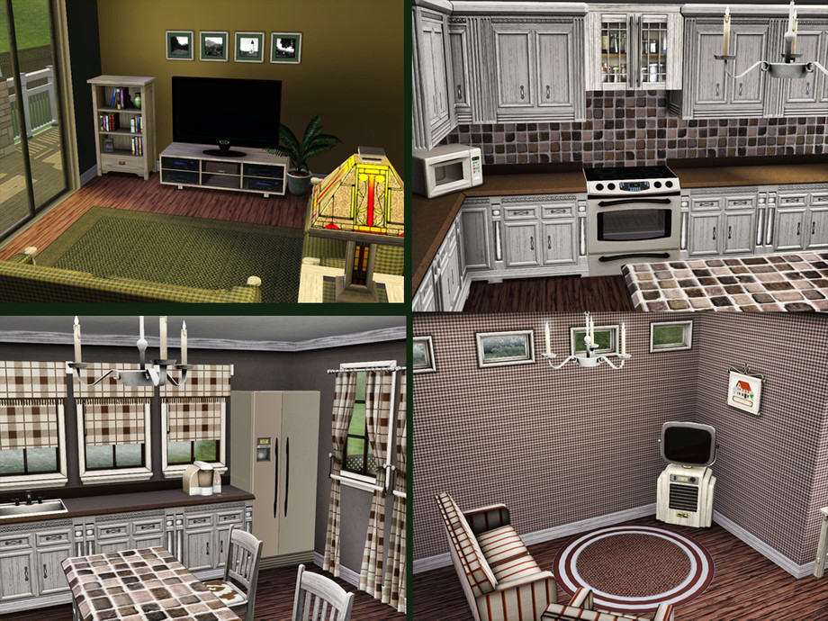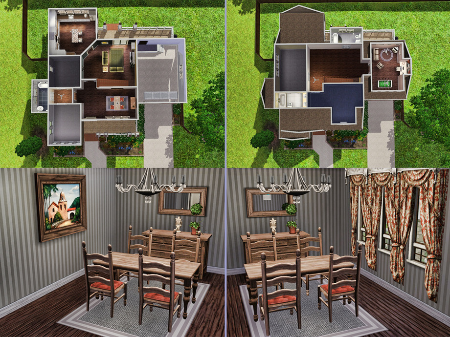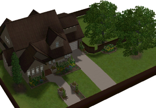 4 bedroom 3 bath home. Complete with formal dining room, living room, large kitchen, and spare room (furnished as a den with computer desk, tv, and game table). All rooms are furnished except for the bedrooms so that you may customize them to perfectly fit your Sims. Fully landscaped with attached garage.