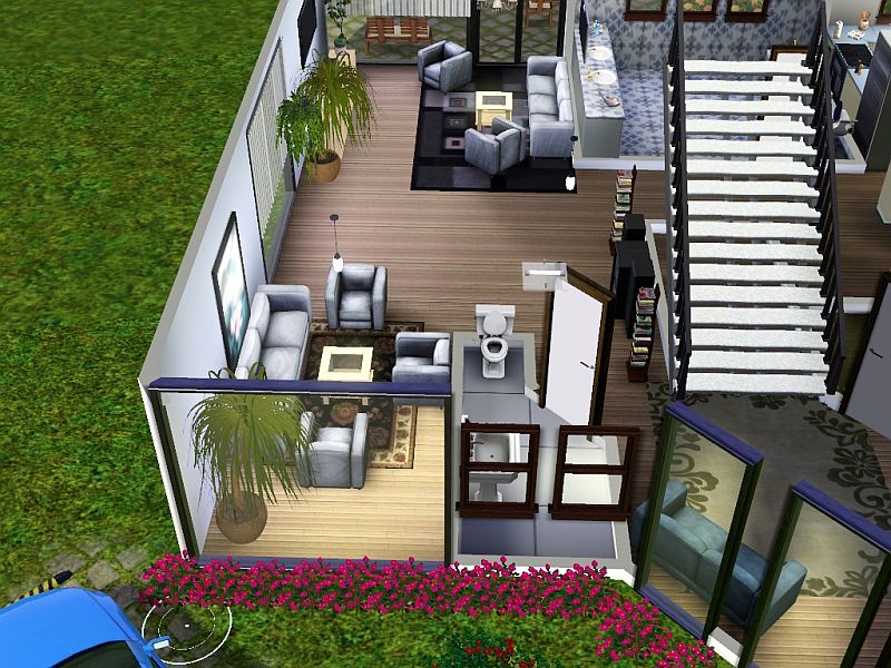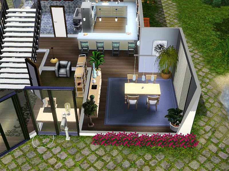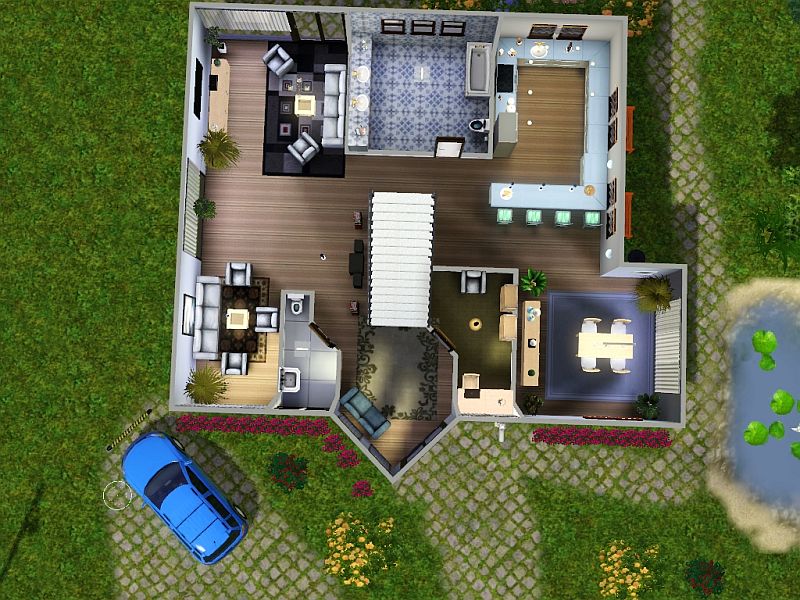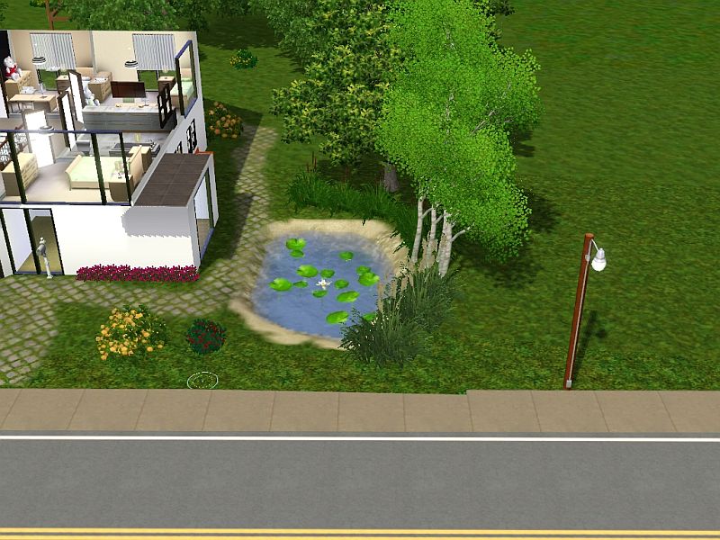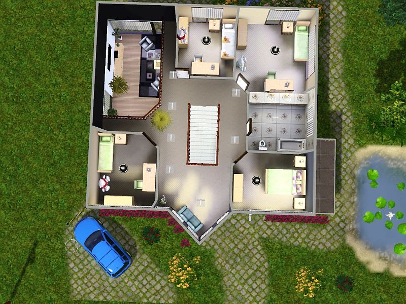 This house is for a bigger family, because it has 4 bedrooms and 2 1/2 bathrooms. The first floor is designed in light blue colors and the second floor in light green. There is room for all the members of your family even the car has its own place. In the garden is a little romantic lake for all nature lovers. Behind the house is a nice terrace with stone grill. Hope your Sims will enjoy this nice home!