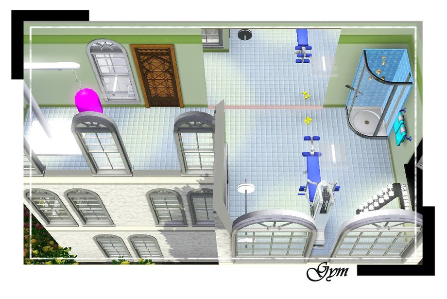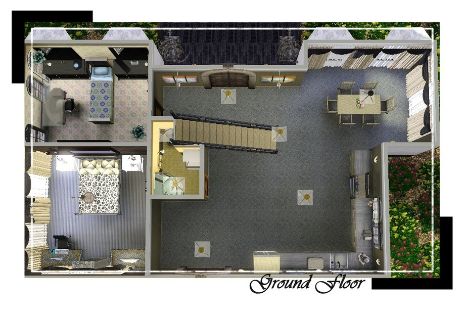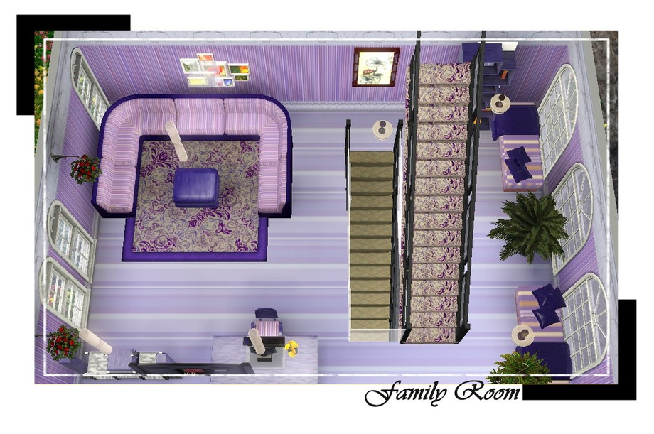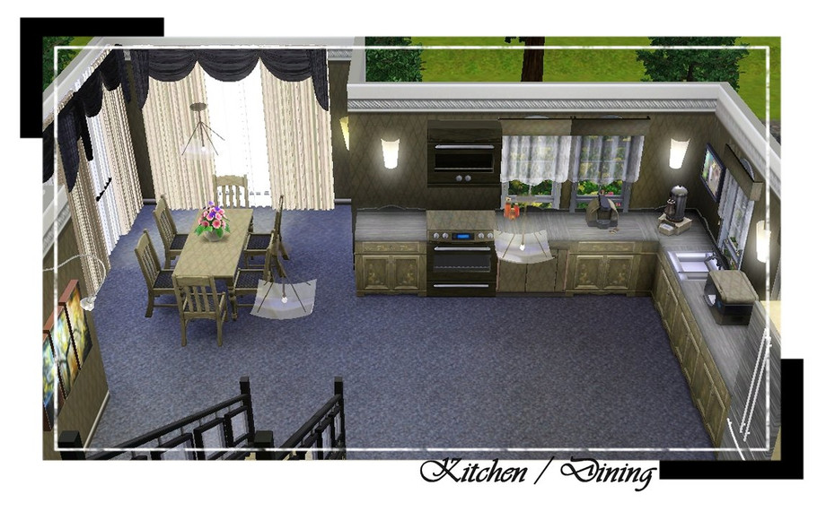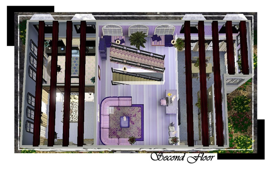 As you walk down the front pathway, you are greeted by a gorgeous , landscaped garden, featuring yellow lilacs, pansies, lavender, and azaleas. Established Spruce and Cypress trees form an evergreen frame for the house. Shale pathways take you all around the house and lead you to a gazebo in the back yard, complete with a bar.b.queue and seating , perfect for outdoor entertaining. There is also a trampoline for those Sims who are into keeping fit.