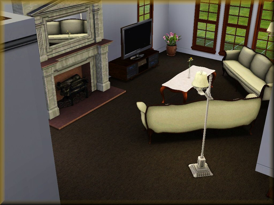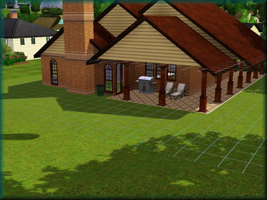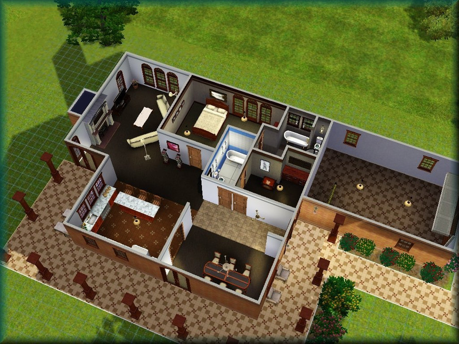 A roomy home for a small family or retired couple. A porch winds from the front of the home to the back porch where your Sims can relax or have a barbecue. The home includes a one car garage, living room, dining room, kitchen, two full baths, and two bedrooms. Fully decorated and furnished on the inside. Landscaped on the outside.