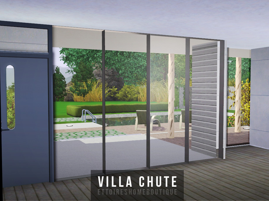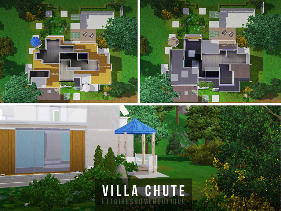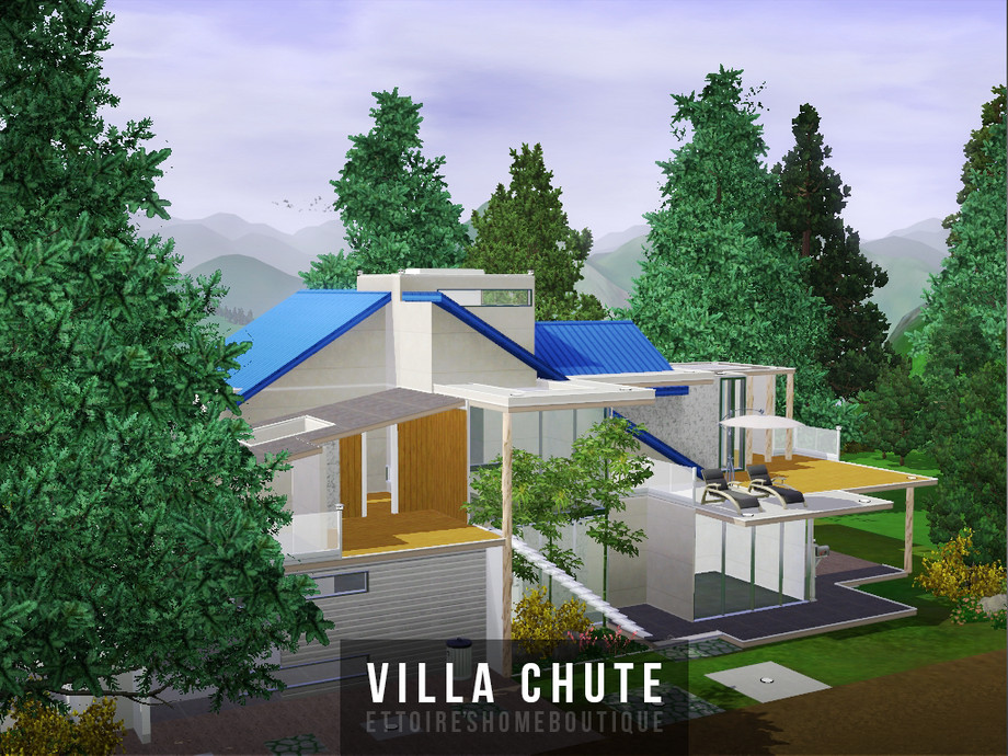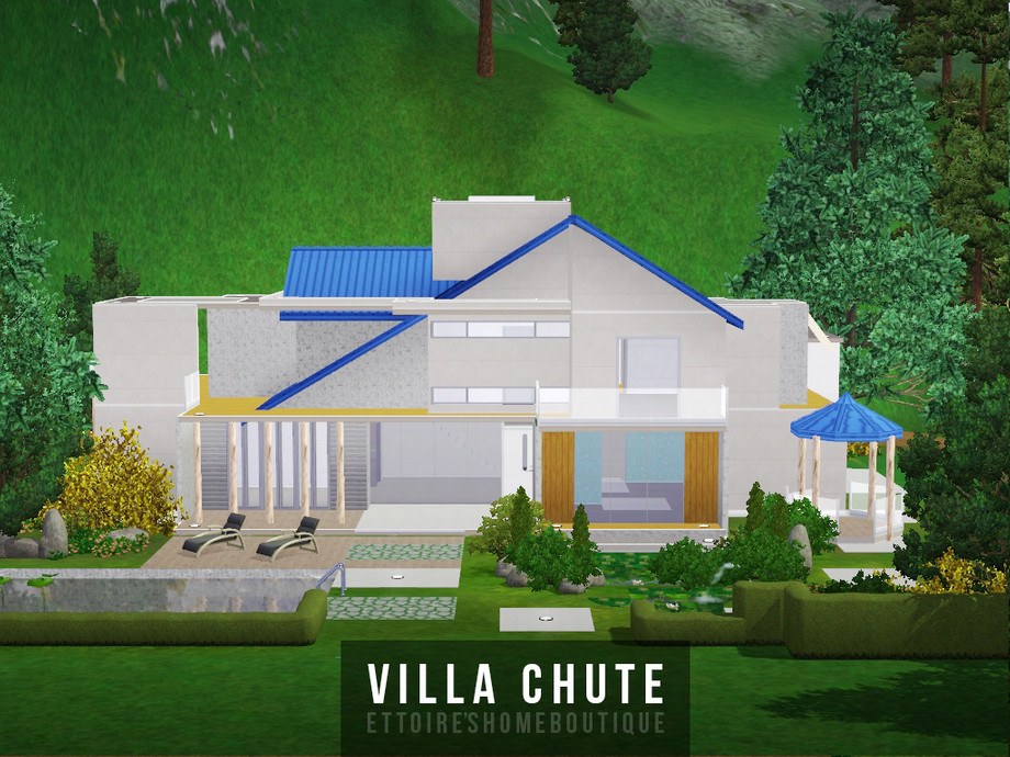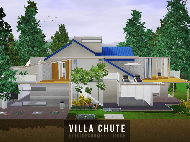 Modern mountain house for your sims! It has two bathrooms, four empty rooms and one big open garage. Big garden has a small pool with a gazebo.