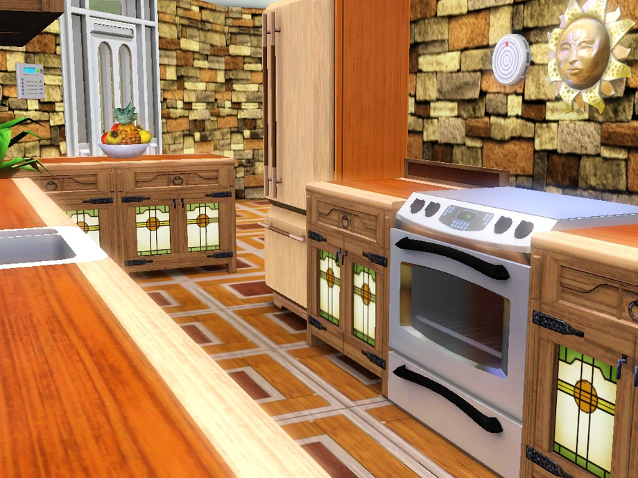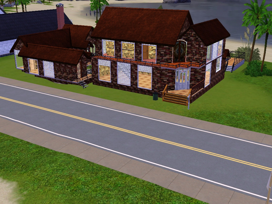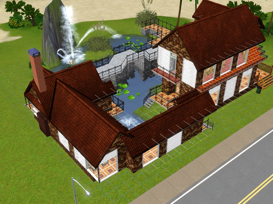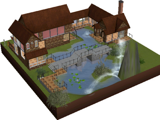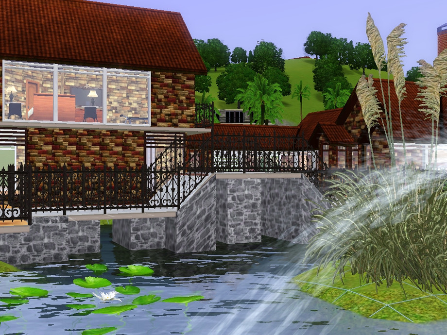 30x30 lot. Main house is two stories. 1st floor is Kitchen, living area combo. Second floor is bedroom and bath . Guest house is one bedroom, one bath and living area with fireplace. The residence over looks a pond that the compound is build around, affording great views from every room. The view can also be enjoyed from outside on one of the terraces or from the stone bridge crossing the pond. Perfect for a single sim or a small family.