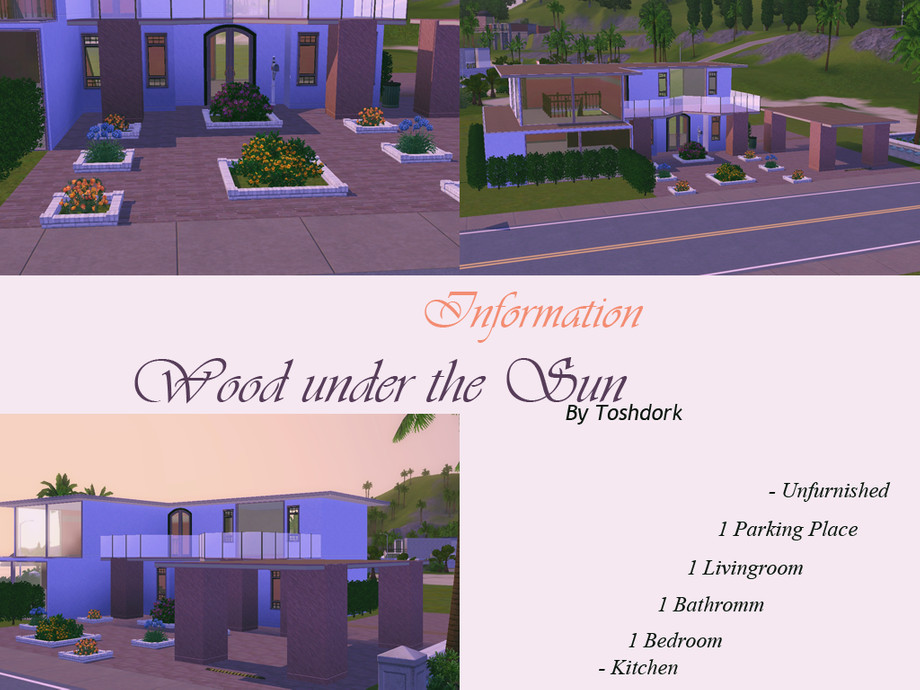 Did your Sim ever dream about a sweet life under the sun ? This house was made for him/her! Mixing the modernity and the sweetness of the wood, this house was designed for a single sim, or a young couple.