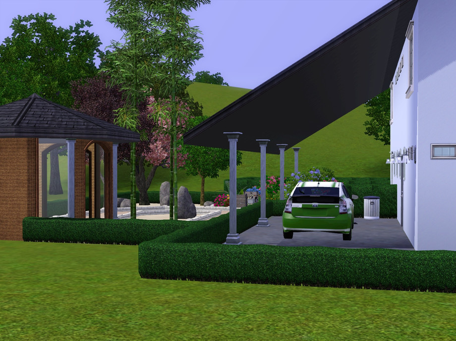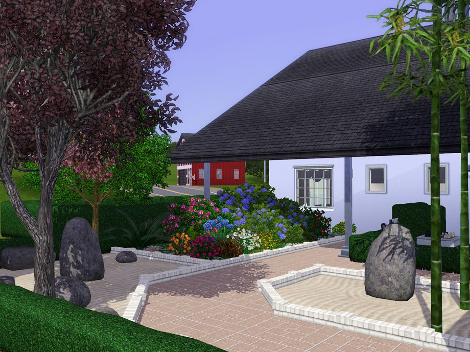 The front door is to the side of the property and there is a covered parking space to the rear. There is a garden with trees, rocks a pagoda and a large flowerbed and to the side there is a pool.