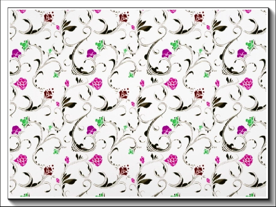 Abstract pattern- jewel shapes and flourishes in red and green on white.