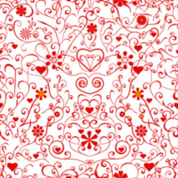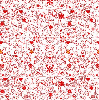 A very busy, but quite clear, repeat pattern featuring red hearts and flowers on a white ground.