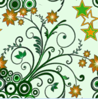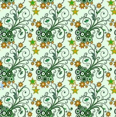Bold green flourishes and circle shapes, accented with gold stars and flowers for a striking abstract pattern.