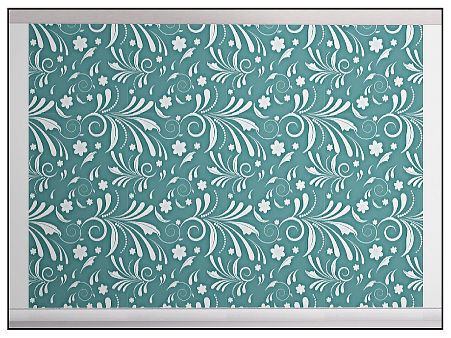 Abstract pattern: style element, flower and leaf shapes in white on light teal