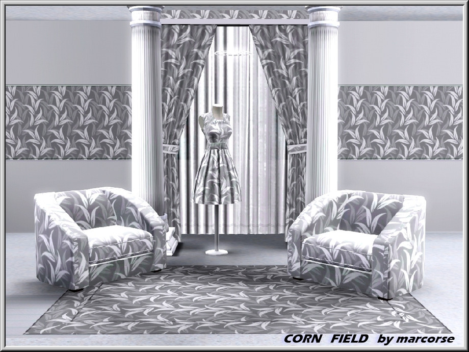 Fabric pattern: stylised corn foliage in tones of grey and white.
