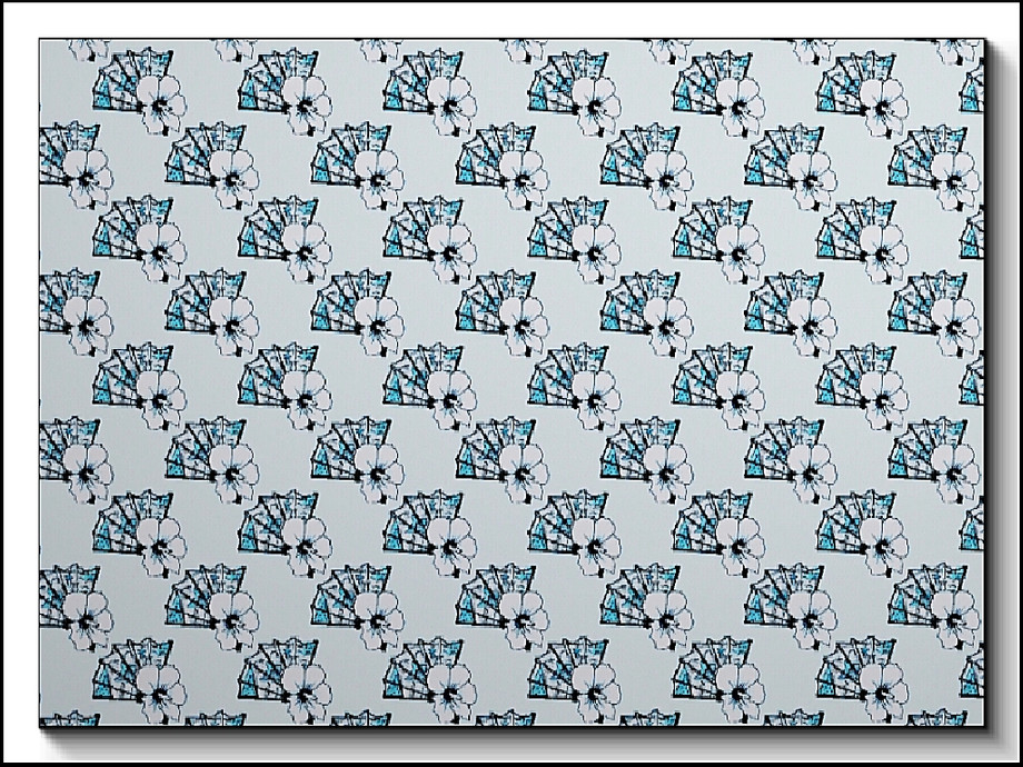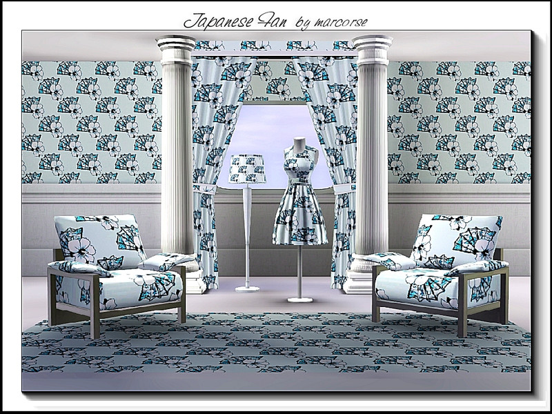 Fabric pattern: Japanese fans and hibiscus blooms in blue and white.