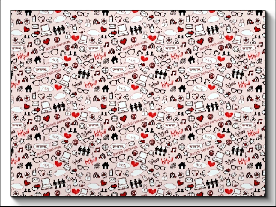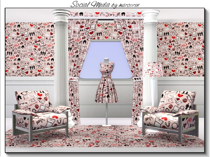 Fabric pattern: random elements associated with social media, in red, black and white.