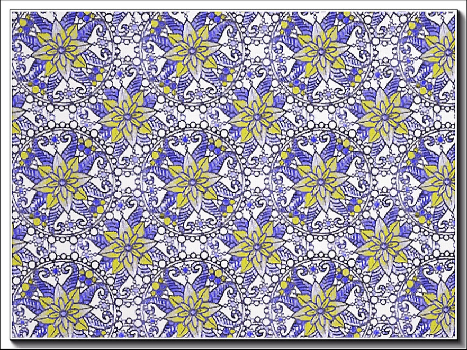 Fabric pattern: floral design with a circular motif in blue and yellow