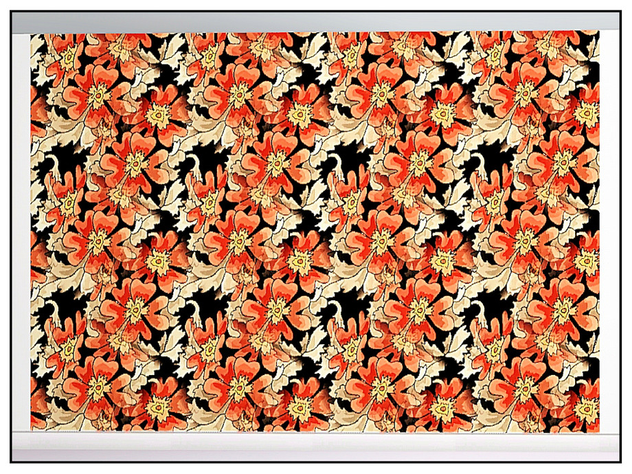 Fabric pattern: Vicorian style floral wallpaper in orange, red and caramel on black