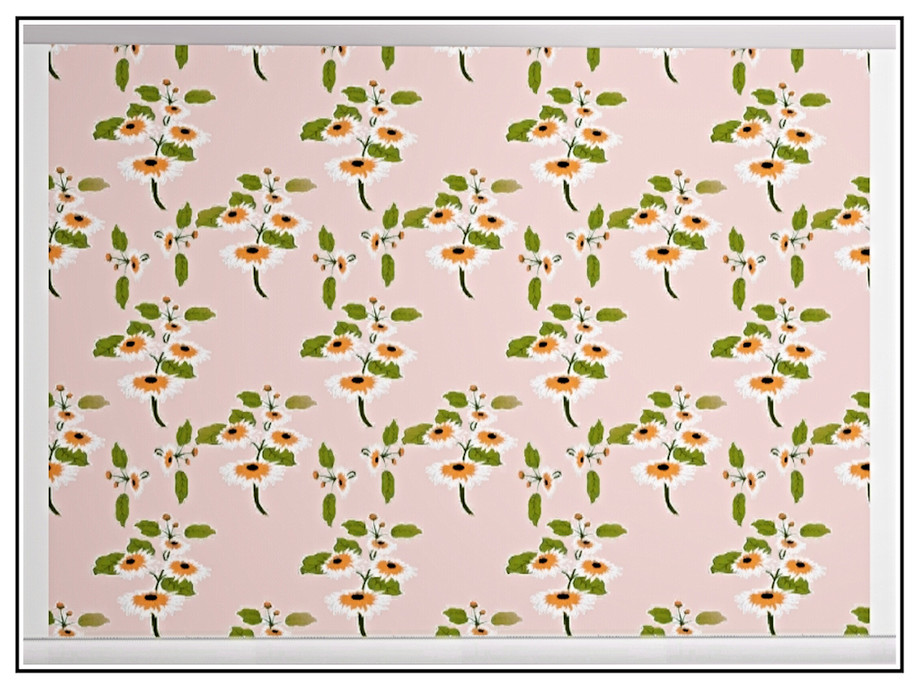 Fabric pattern - orange and white sunflowers and green leaves in an upright design.