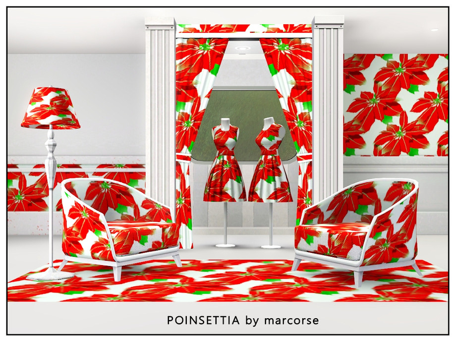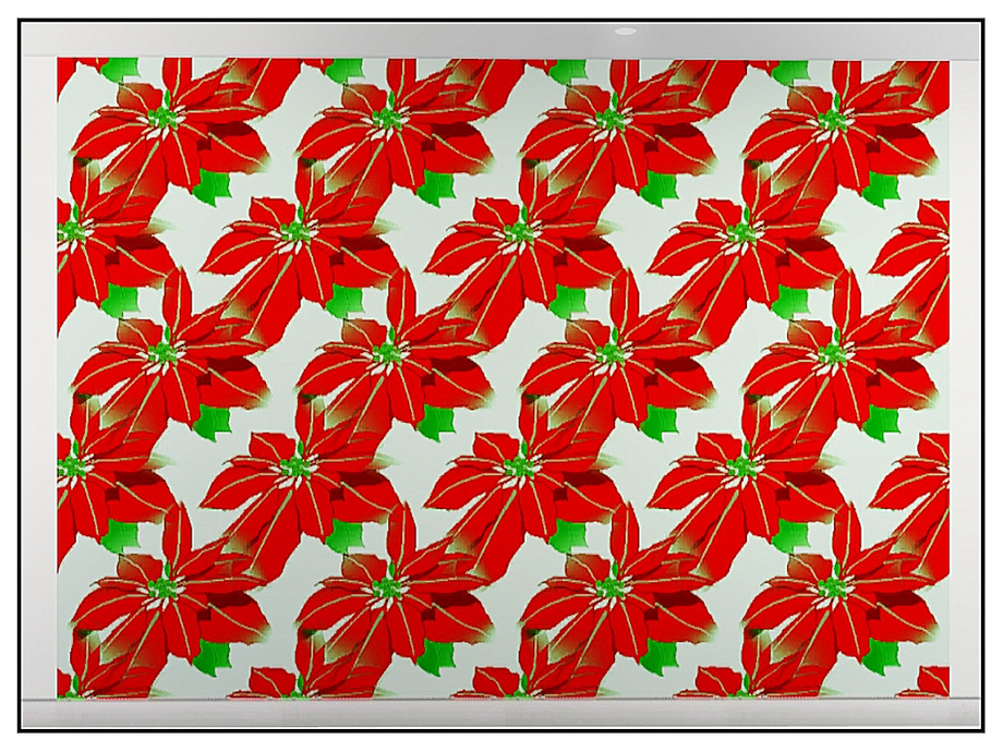 Fabric pattern: bold red poinsettia bracts with green accents on white.