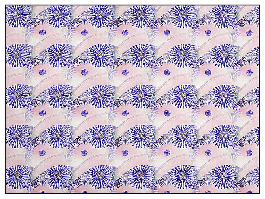 Fabric pattern - deep blue daisy shapes in a swathed design with palest pink accents.